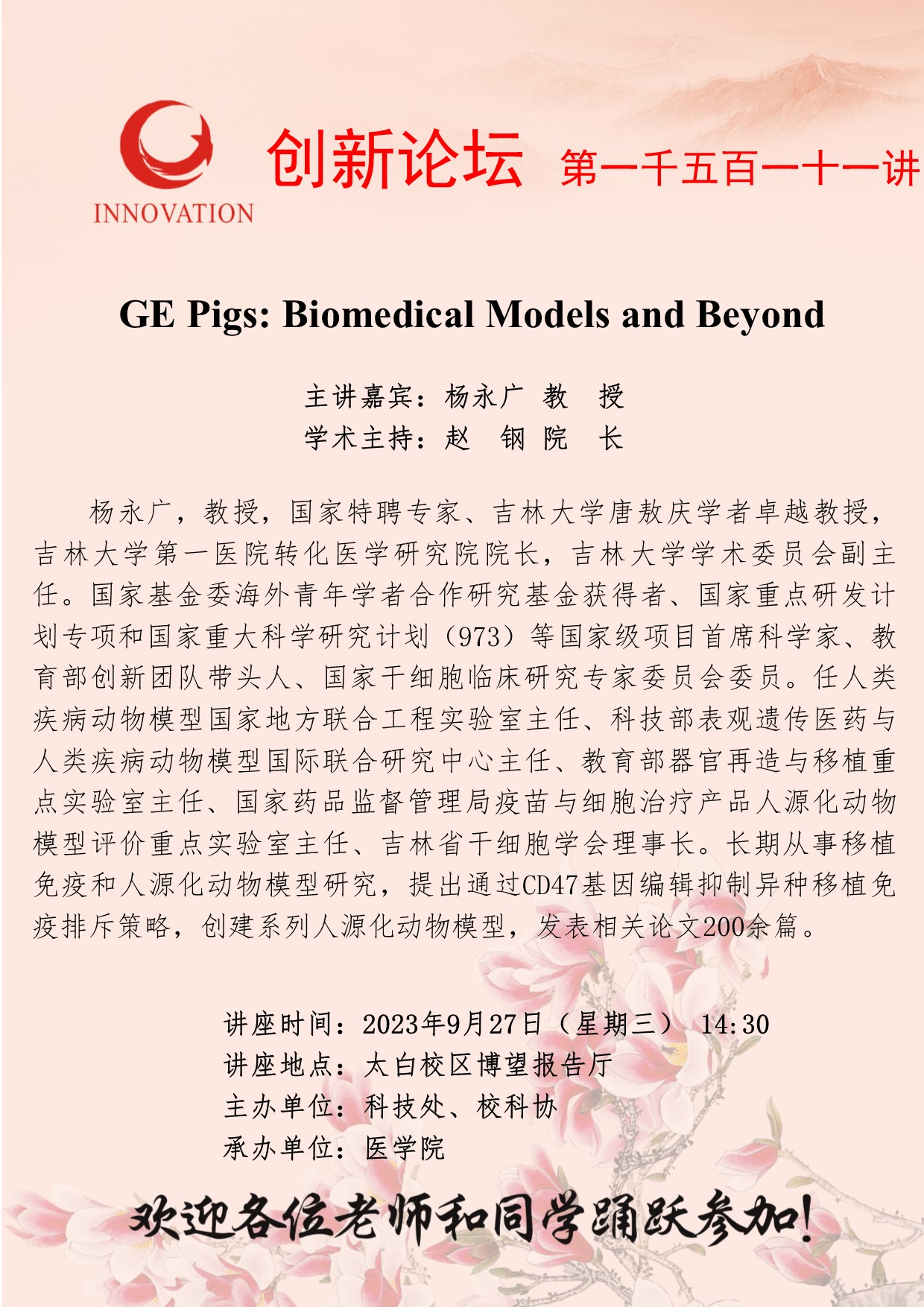 杨永广 教 授 赢博官方(中国)总部创新论坛第一千五百一十一讲:GE Pigs: Biomedical Models and Beyond 讲座时间 2023年9月27日(星期三) 14:30 讲座地点 太白校区博望报告厅 讲座人介绍 杨永广 教 授 讲座内容