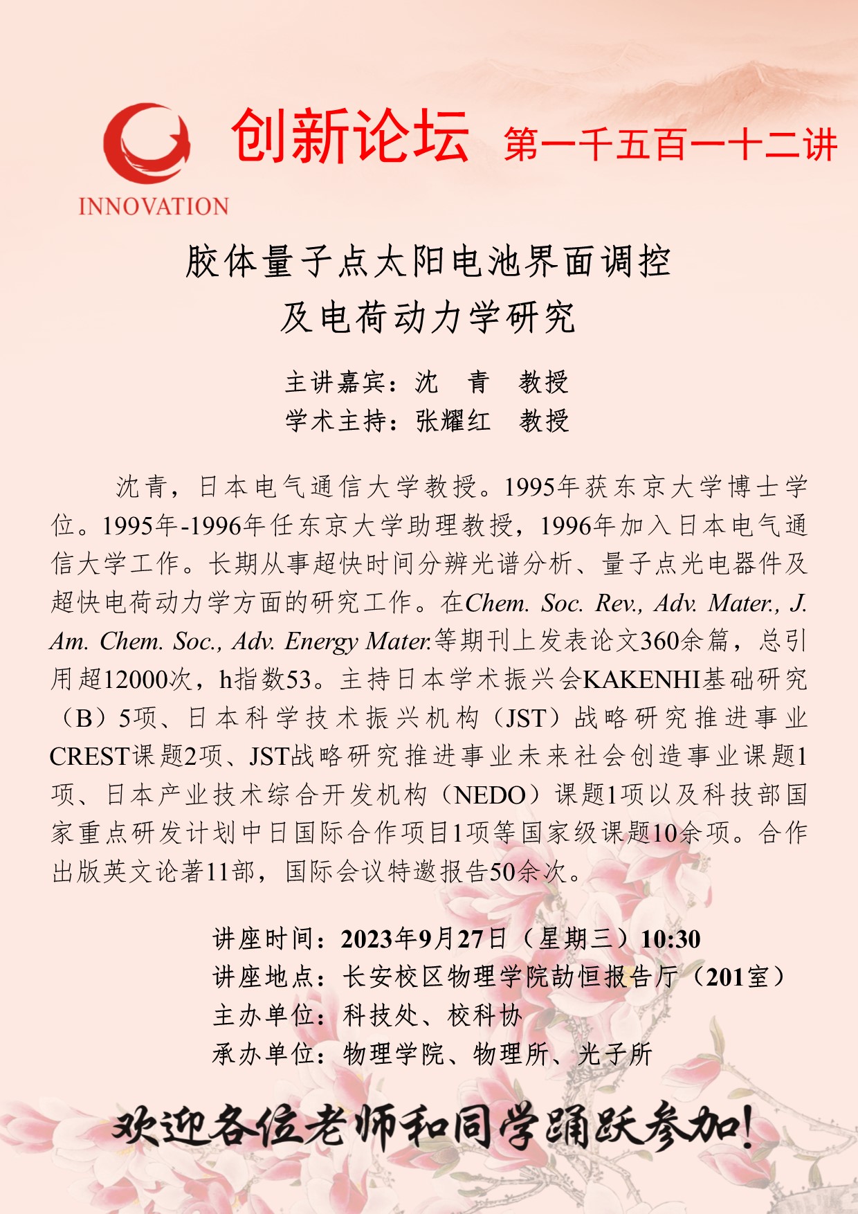 沈青 教授 赢博官方(中国)总部创新论坛第一千五百一十二讲:胶体量子点太阳电池界面调控及电荷动力学研究 讲座时间 2023年9月27日(星期三)10:30 讲座地点 长安校区物理学院劼恒报告厅(201室) 讲座人介绍 沈青 教授 讲座内容