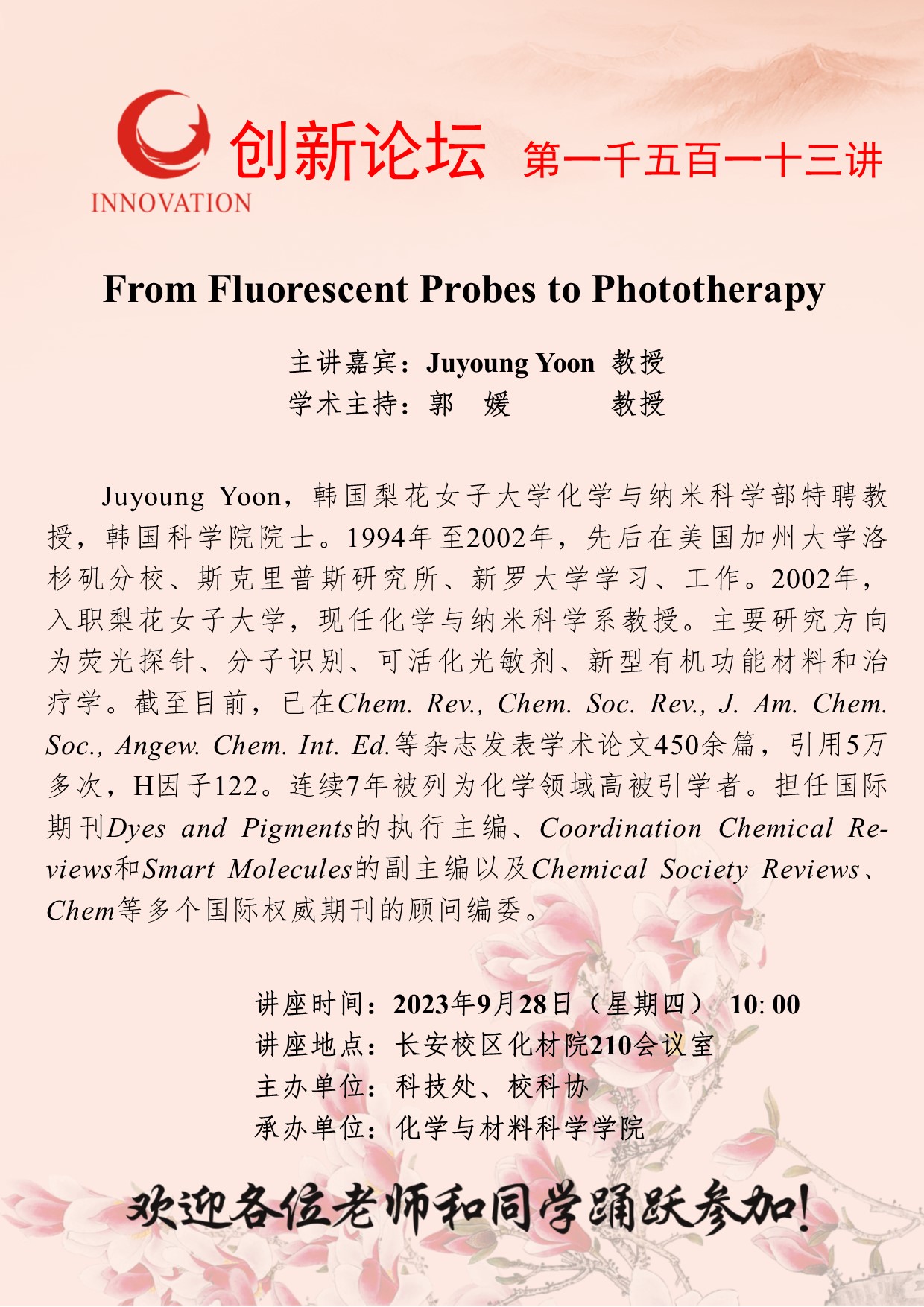 Juyoung Yoon 教授 赢博官方(中国)总部创新论坛第一千五百一十三讲:From Fluorescent Probes to Phototherapy 讲座时间 2023年9月28日(星期四) 10: 00 讲座地点 长安校区化材院210会议室 讲座人介绍 Juyoung Yoon 教授 讲座内容