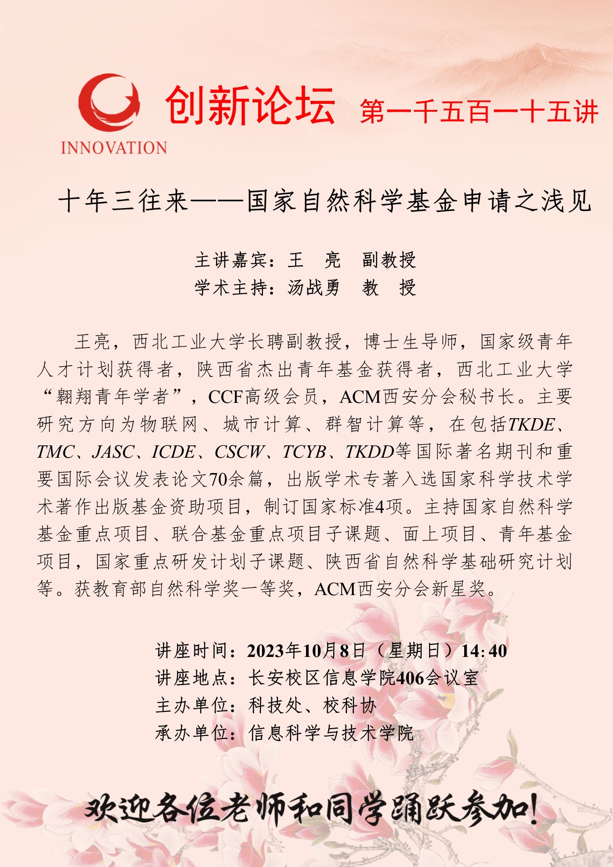王亮 副教授 赢博官方(中国)总部创新论坛第一千五百一十五讲: 十年三往来——国家自然科学基金申请之浅见 讲座时间 2023年10月8日(星期日)14:40 讲座地点 长安校区信息学院406会议室 讲座人介绍 王亮 副教授 讲座内容