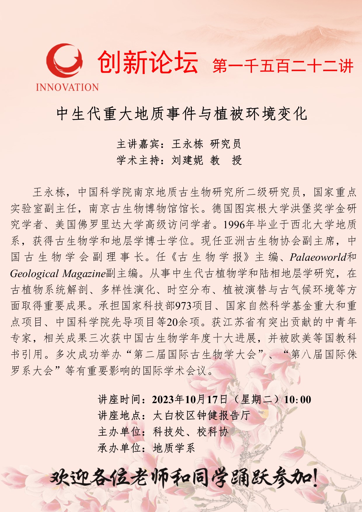 王永栋 研究员 赢博官方(中国)总部创新论坛第一千五百二十二讲:中生代重大地质事件与植被环境变化 讲座时间 2023年10月17日(星期二)10:00 讲座地点 太白校区钟健报告厅 讲座人介绍 王永栋 研究员 讲座内容