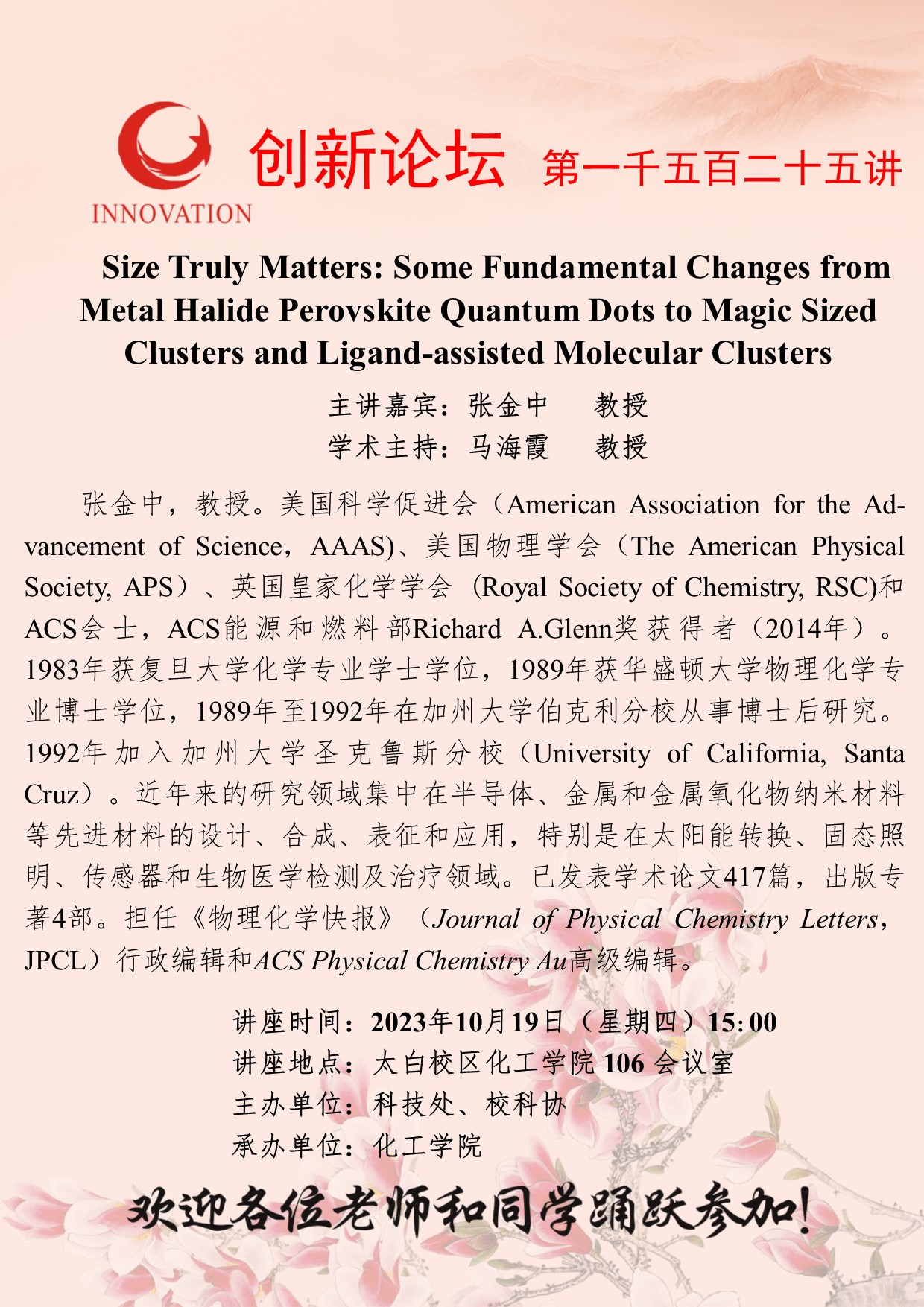 张金中 教授 赢博官方(中国)总部创新论坛第一千五百二十五讲:Size Truly Matters: Some Fundamental Changes from Metal Halide Perovskite Quantum Dots to Magic Sized Clusters and Ligand-assisted Molecular Clusters 讲座时间 2023年10月19日(星期四)15:00 讲座地点 太白校区化工学院106会议室 讲座人介绍 张金中 教授 讲座内容