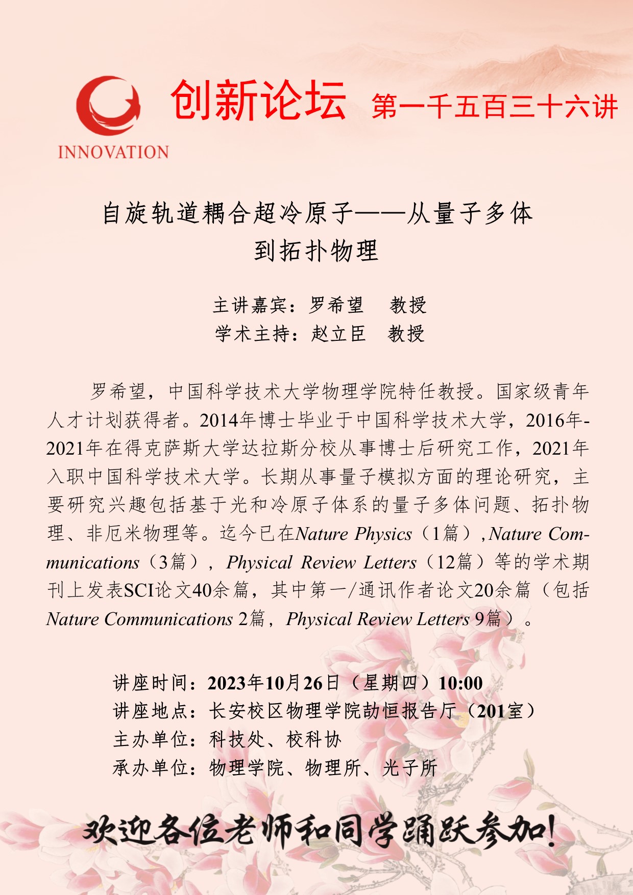 罗希望 教授 赢博官方(中国)总部创新论坛第一千五百三十六讲:自旋轨道耦合超冷原子——从量子多体到拓扑物理 讲座时间 2023年10月26日(星期四)10:00 讲座地点 长安校区物理学院劼恒报告厅(201室) 讲座人介绍 罗希望 教授 讲座内容