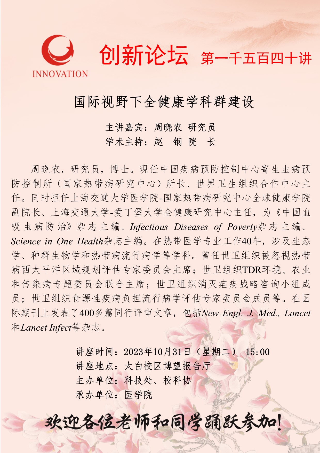 周晓农 研究员 赢博官方(中国)总部创新论坛第一千五百四十讲:国际视野下全健康学科群建设 讲座时间 2023年10月31日(星期二) 15:00 讲座地点 太白校区博望报告厅 讲座人介绍 周晓农 研究员 讲座内容