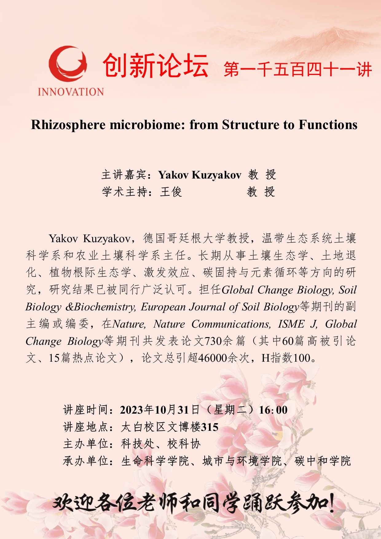 Yakov Kuzyakov 教 授 赢博官方(中国)总部创新论坛第一千五百四十一讲:Rhizosphere microbiome: from Structure to Functions 讲座时间 2023年10月31日(星期二)16:00 讲座地点 太白校区文博楼315 讲座人介绍 Yakov Kuzyakov 教 授 讲座内容