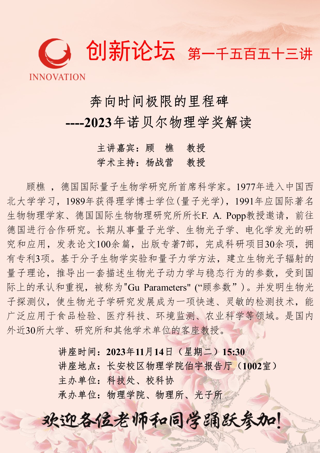 顾樵 教授 赢博官方(中国)总部创新论坛第一千五百五十三讲:奔向时间极限的里程碑----2023年诺贝尔物理学奖解读 讲座时间 2023年11月14日(星期二)15:30 讲座地点 长安校区物理学院伯宇报告厅(1002室) 讲座人介绍 顾樵 教授 讲座内容
