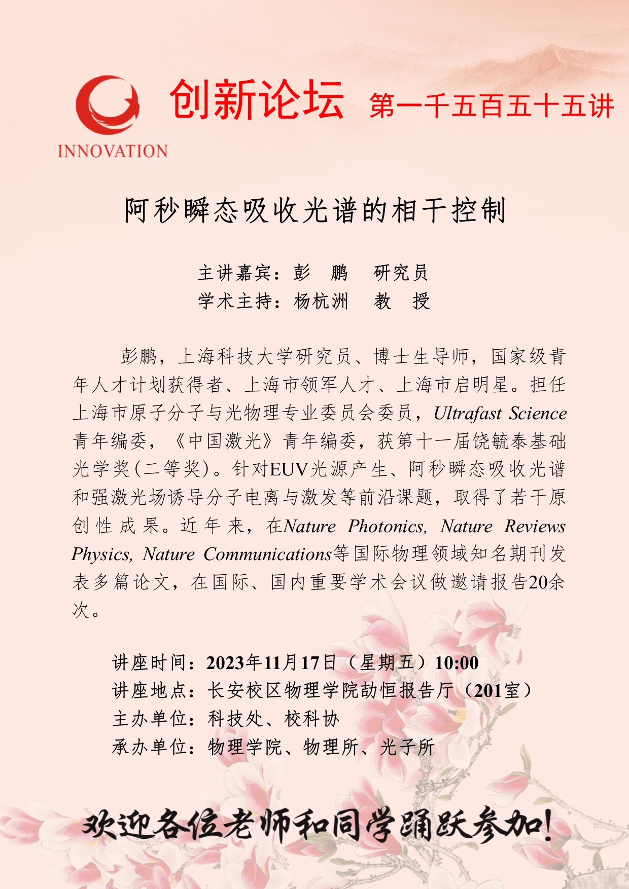 彭鹏 研究员 赢博官方(中国)总部创新论坛第一千五百五十五讲:阿秒瞬态吸收光谱的相干控制 讲座时间 2023年11月17日(星期五)10:00 讲座地点 长安校区物理学院劼恒报告厅(201室) 讲座人介绍 彭鹏 研究员 讲座内容