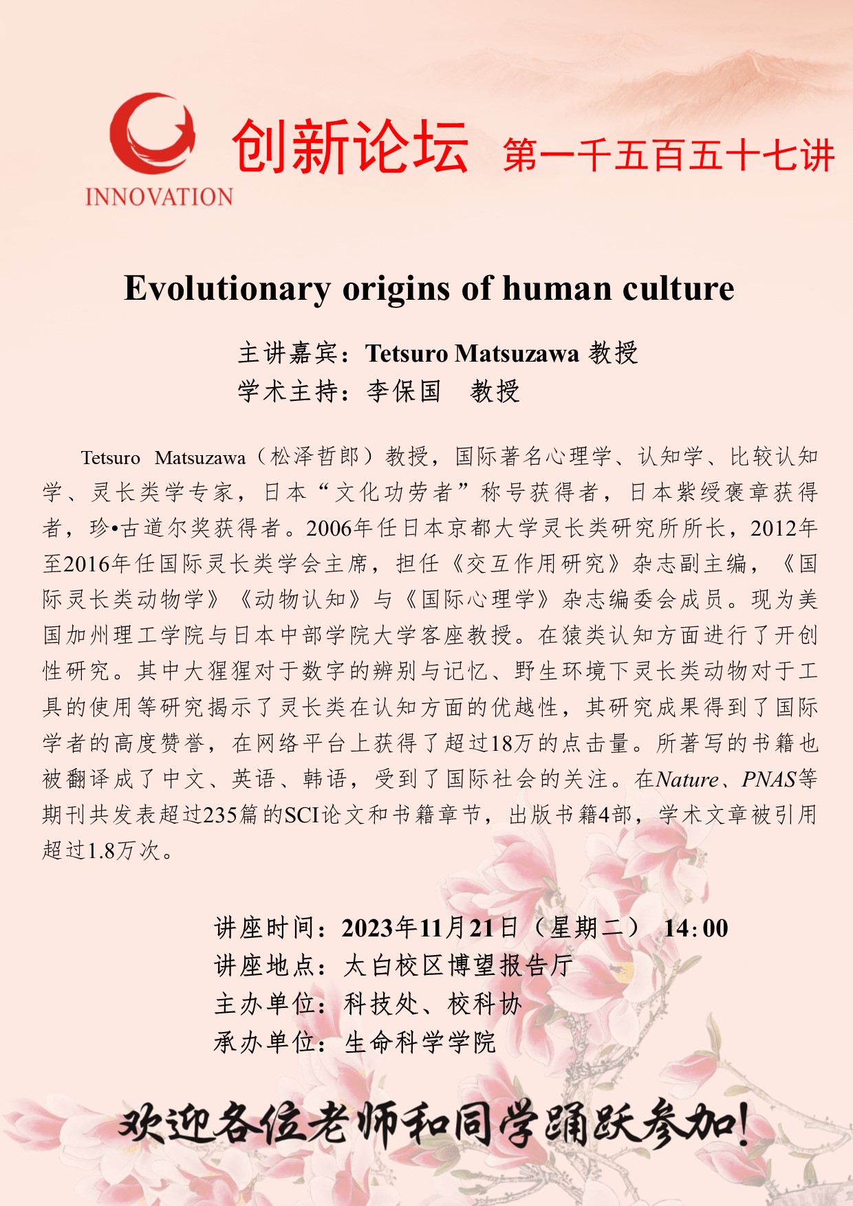 Tetsuro Matsuzawa 教授 赢博官方(中国)总部创新论坛第一千五百五十七讲:Evolutionary origins of human culture 讲座时间 2023年11月21日(星期二) 14:00 讲座地点 太白校区博望报告厅 讲座人介绍 Tetsuro Matsuzawa 教授 讲座内容