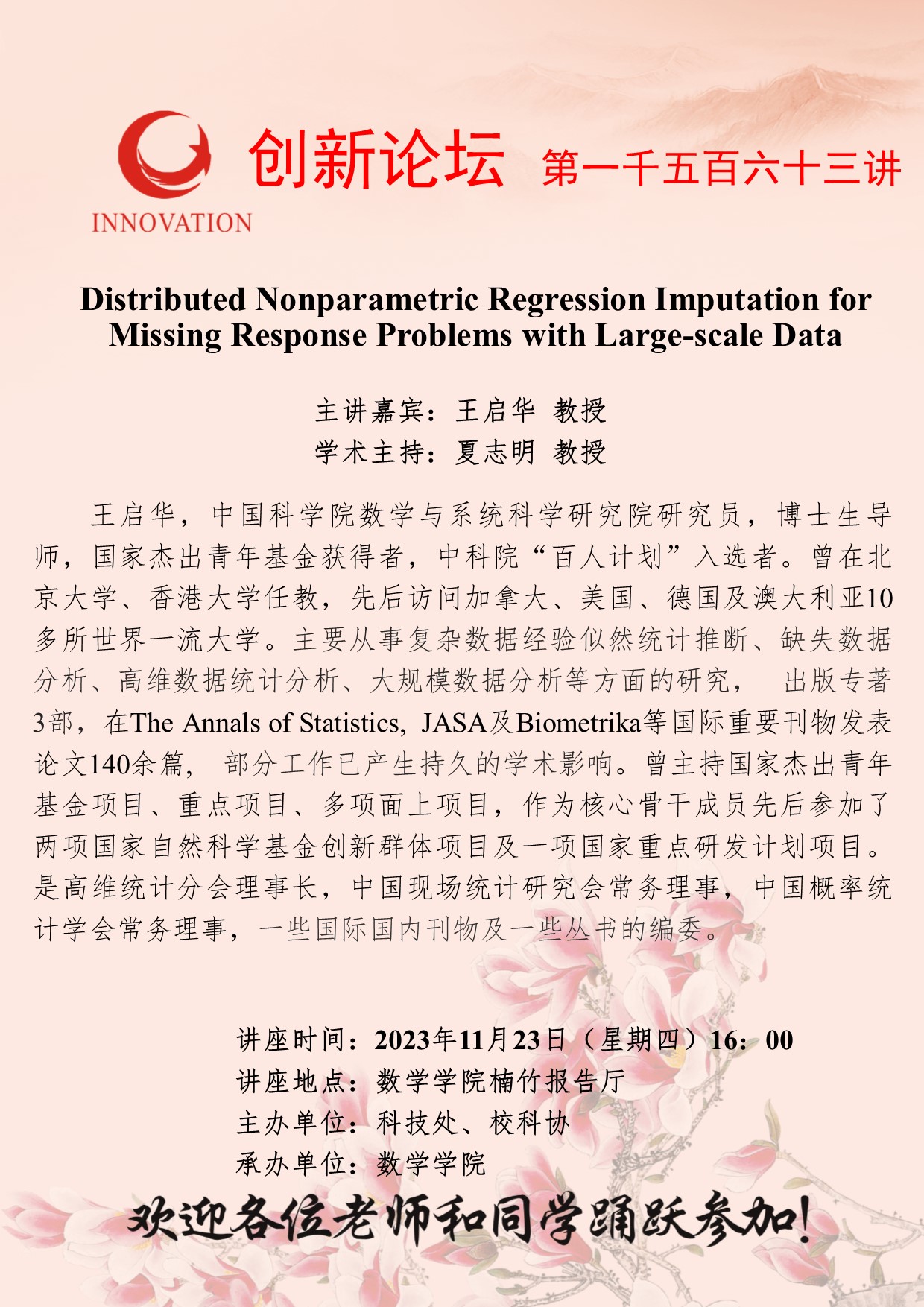 王启华 教授 赢博官方(中国)总部创新论坛第一千五百六十三讲:Distributed Nonparametric Regression Imputation for Missing Response Problems with Large-scale Data 讲座时间 2023年11月23日(周四)16:00 讲座地点 数学学院楠竹报告厅 讲座人介绍 王启华 教授 讲座内容