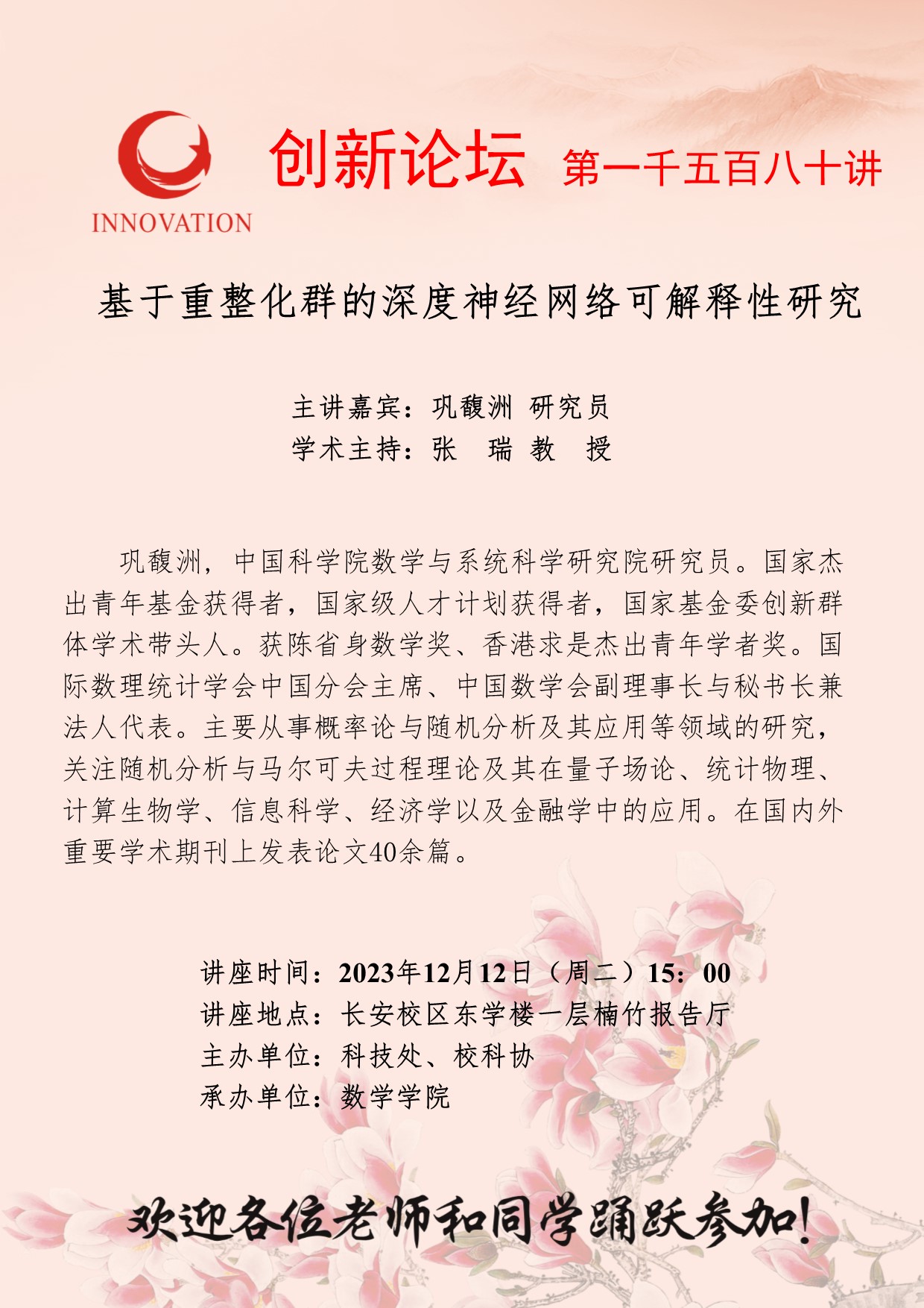 巩馥洲 研究员 赢博官方(中国)总部创新论坛第一千五百八十讲:基于重整化群的深度神经网络可解释性研究 讲座时间 2023年12月12日(周二)15:00 讲座地点 长安校区东学楼一层楠竹报告厅 讲座人介绍 巩馥洲 研究员 讲座内容