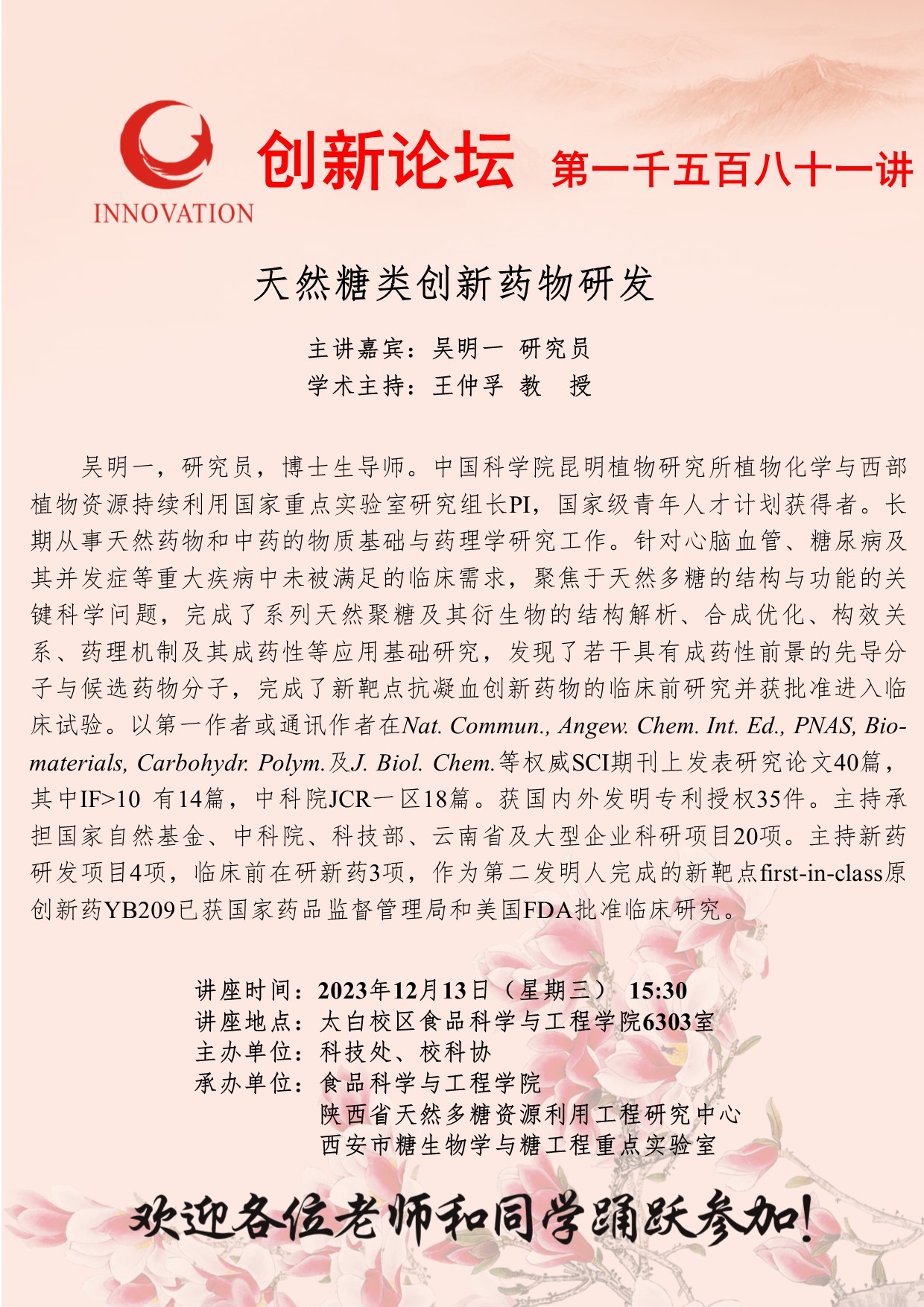 吴明一 研究员 赢博官方(中国)总部创新论坛第一千五百八十一讲:天然糖类创新药物研发 讲座时间 2023年12月13日(星期三) 15:30 讲座地点 太白校区食品科学与工程学院6303室 讲座人介绍 吴明一 研究员 讲座内容