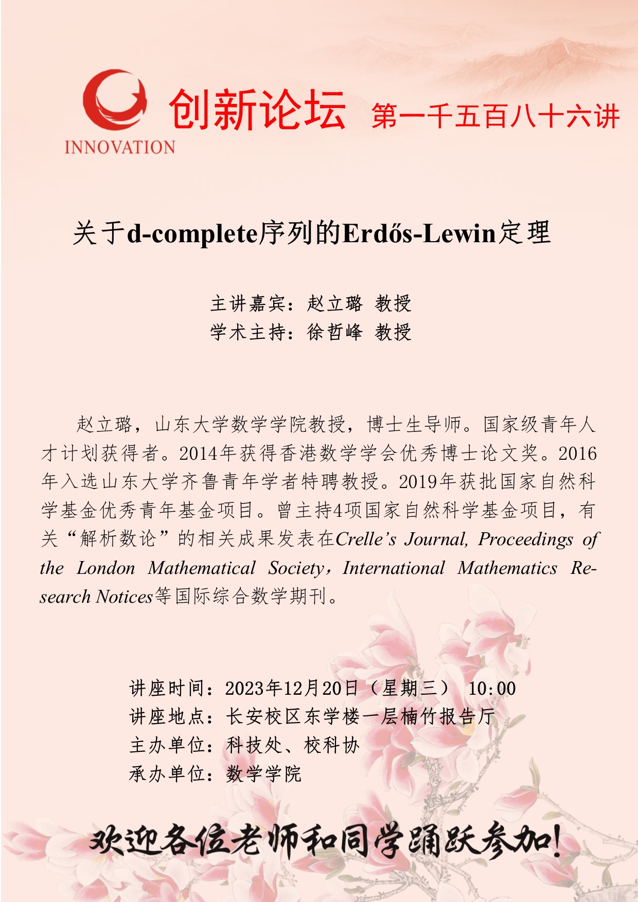 赵立璐 教授 赢博官方(中国)总部创新论坛第一千五百八十六讲:关于d-complete序列的Erdős-Lewin定理 讲座时间 2023年12月20日(星期三) 10:00 讲座地点 长安校区东学楼一层楠竹报告厅 讲座人介绍 赵立璐 教授 讲座内容