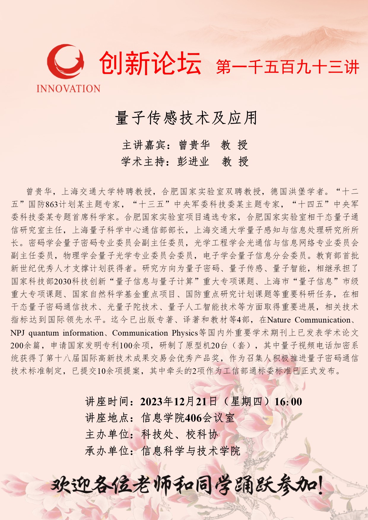 曾贵华 教授 赢博官方(中国)总部创新论坛第一千五百九十三讲:量子传感技术及应用 讲座时间 2023年12月21日(星期四)16:00 讲座地点 信息学院406会议室 讲座人介绍 曾贵华 教授 讲座内容