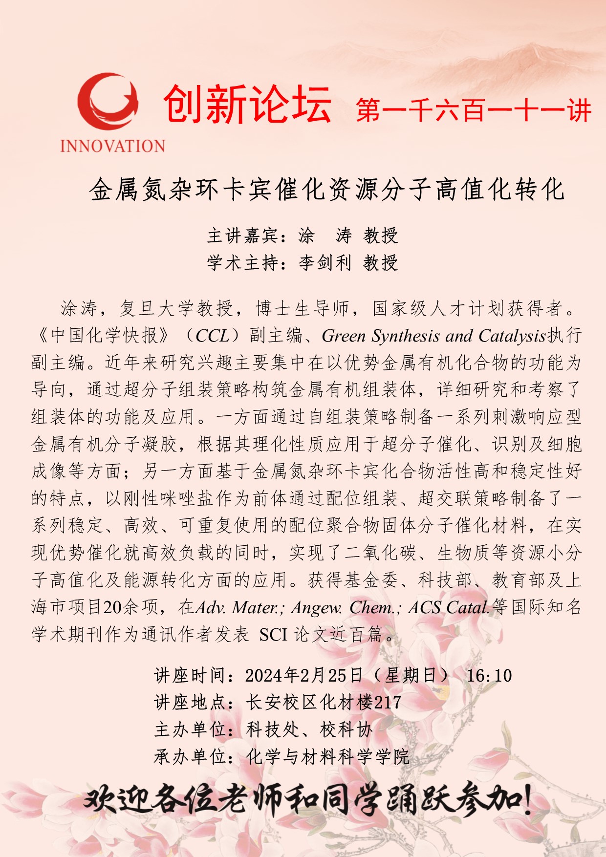 涂涛 教授 赢博官方(中国)总部创新论坛第一千六百一十一讲:金属氮杂环卡宾催化资源分子高值化转化 讲座时间 2024年2月25日(星期日) 16:10 讲座地点 长安校区化材楼217 讲座人介绍 涂涛 教授 讲座内容