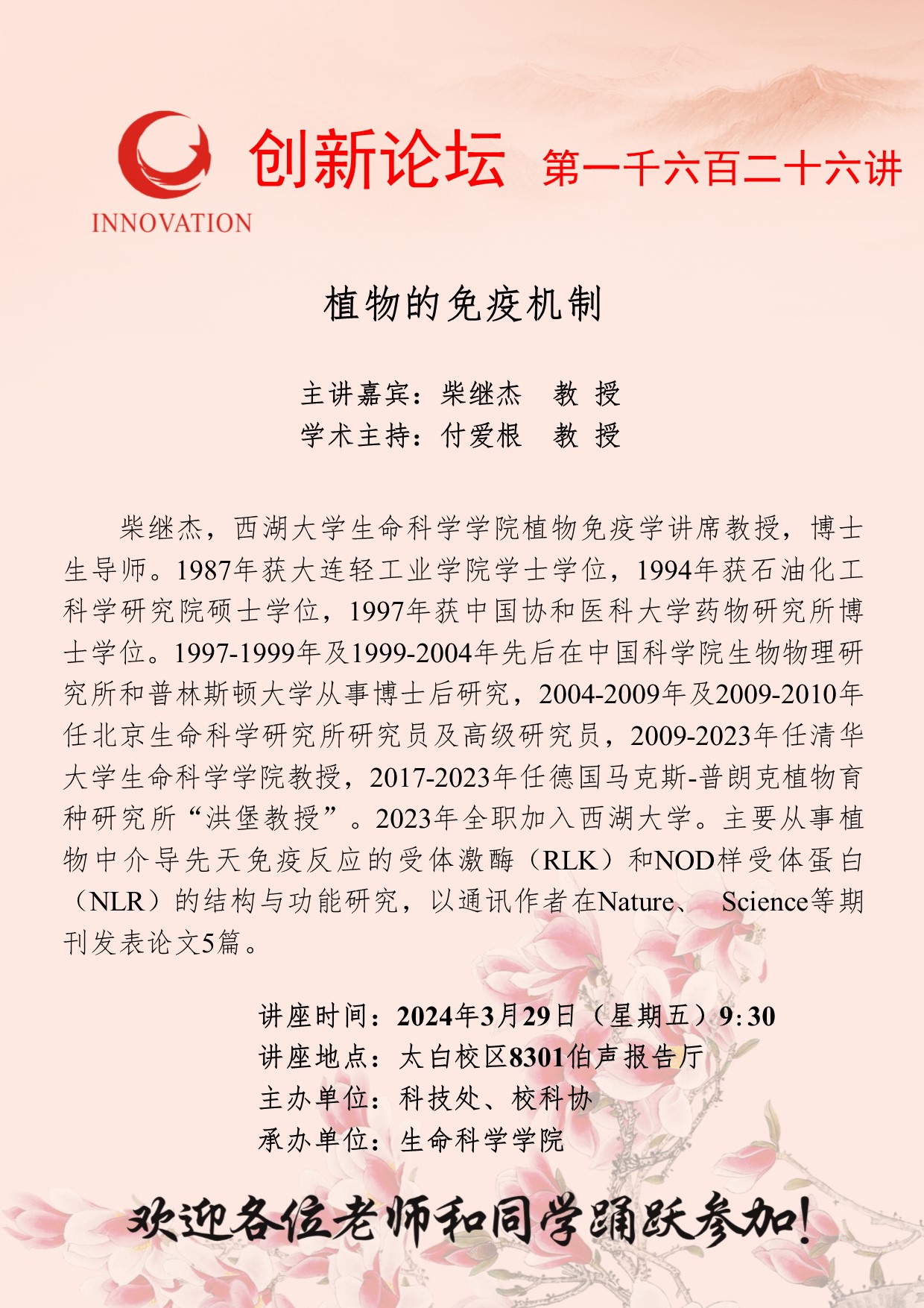 柴继杰 教授 赢博官方(中国)总部创新论坛第一千六百二十六讲:植物的免疫机制 讲座时间 2024年3月29日(星期五)09:30 讲座地点 太白校区8301伯声报告厅 讲座人介绍 柴继杰 教授 讲座内容