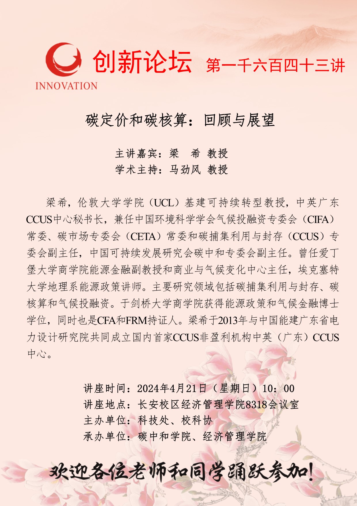 梁希 教授 赢博官方(中国)总部创新论坛第一千六百四十三讲:碳定价和碳核算:回顾与展望 讲座时间 2024年4月21日(星期日)10:00 讲座地点 长安校区经济管理学院8318会议室 讲座人介绍 梁希 教授 讲座内容