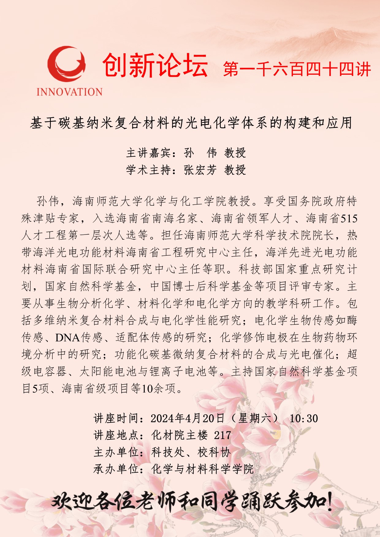 孙伟 教授 赢博官方(中国)总部创新论坛第一千六百四十四讲:基于碳基纳米复合材料的光电化学体系的构建和应用 讲座时间 2024年4月20日(星期六) 10:30 讲座地点 化材院主楼 217 讲座人介绍 孙伟 教授 讲座内容