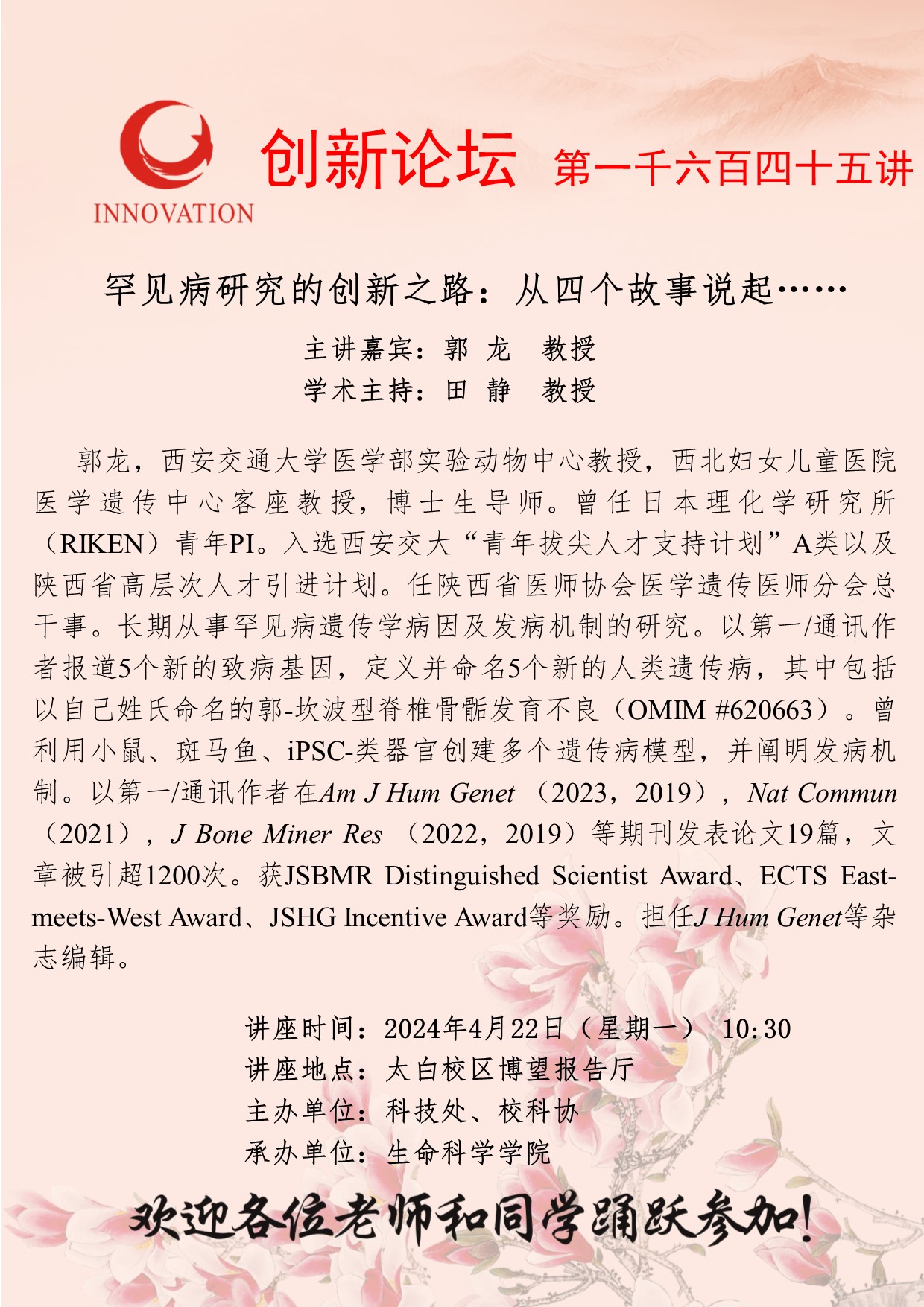 郭龙 教授 赢博官方(中国)总部创新论坛第一千六百四十五讲:罕见病研究的创新之路:从四个故事说起…… 讲座时间 2024年4月22日(星期一) 10:30 讲座地点 太白校区博望报告厅 讲座人介绍 郭龙 教授 讲座内容
