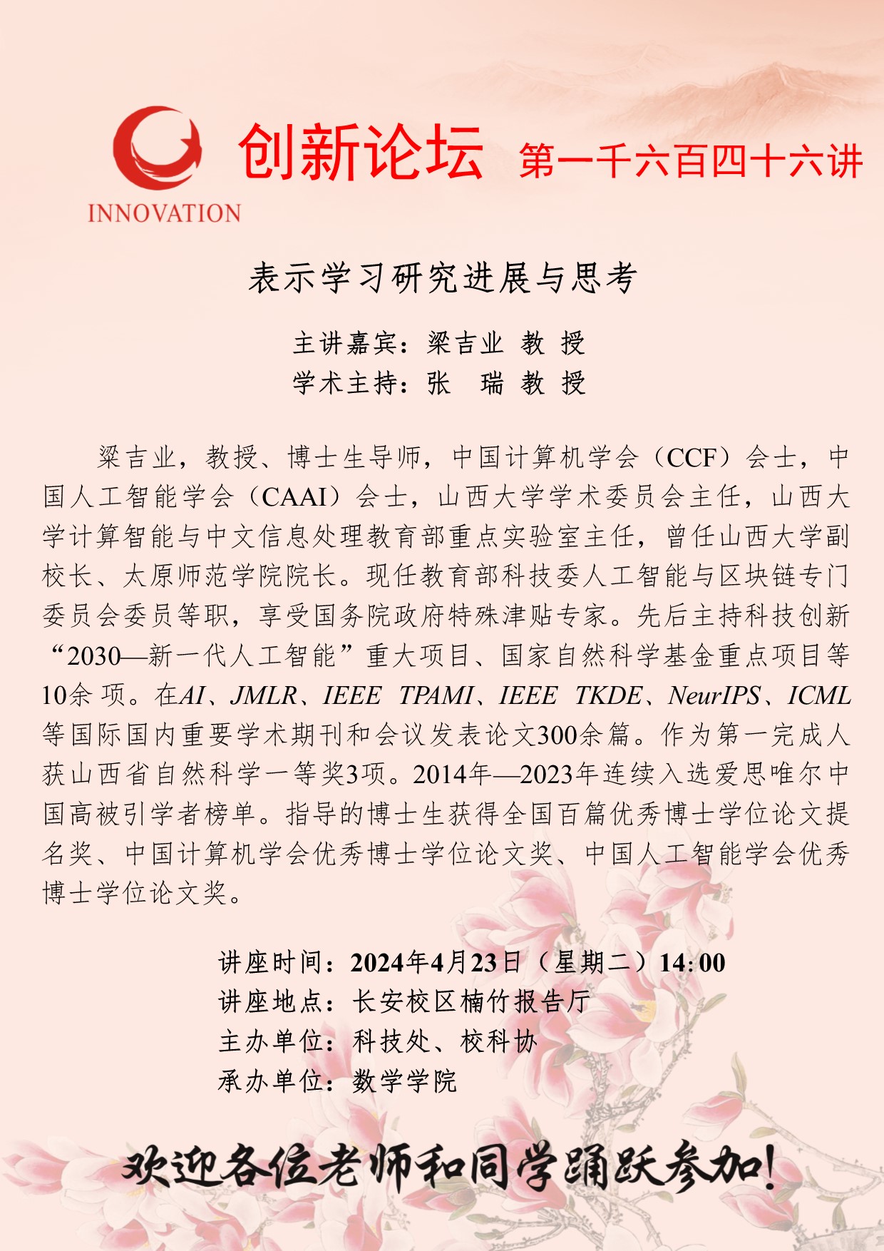 梁吉业 教授 赢博官方(中国)总部创新论坛第一千六百四十六讲:表示学习研究进展与思考 讲座时间 2024年4月23日(星期二)14:00 讲座地点 长安校区楠竹报告厅 讲座人介绍 梁吉业 教授 讲座内容