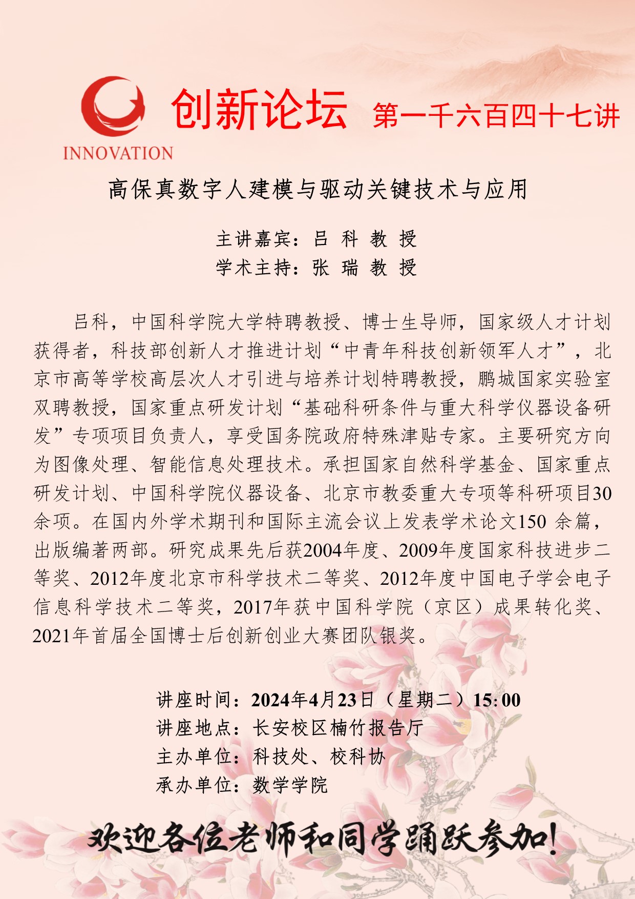 吕科 教授 赢博官方(中国)总部创新论坛第一千六百四十七讲:高保真数字人建模与驱动关键技术与应用 讲座时间 2024年4月23日(星期二)15:00 讲座地点 长安校区楠竹报告厅 讲座人介绍 吕科 教授 讲座内容