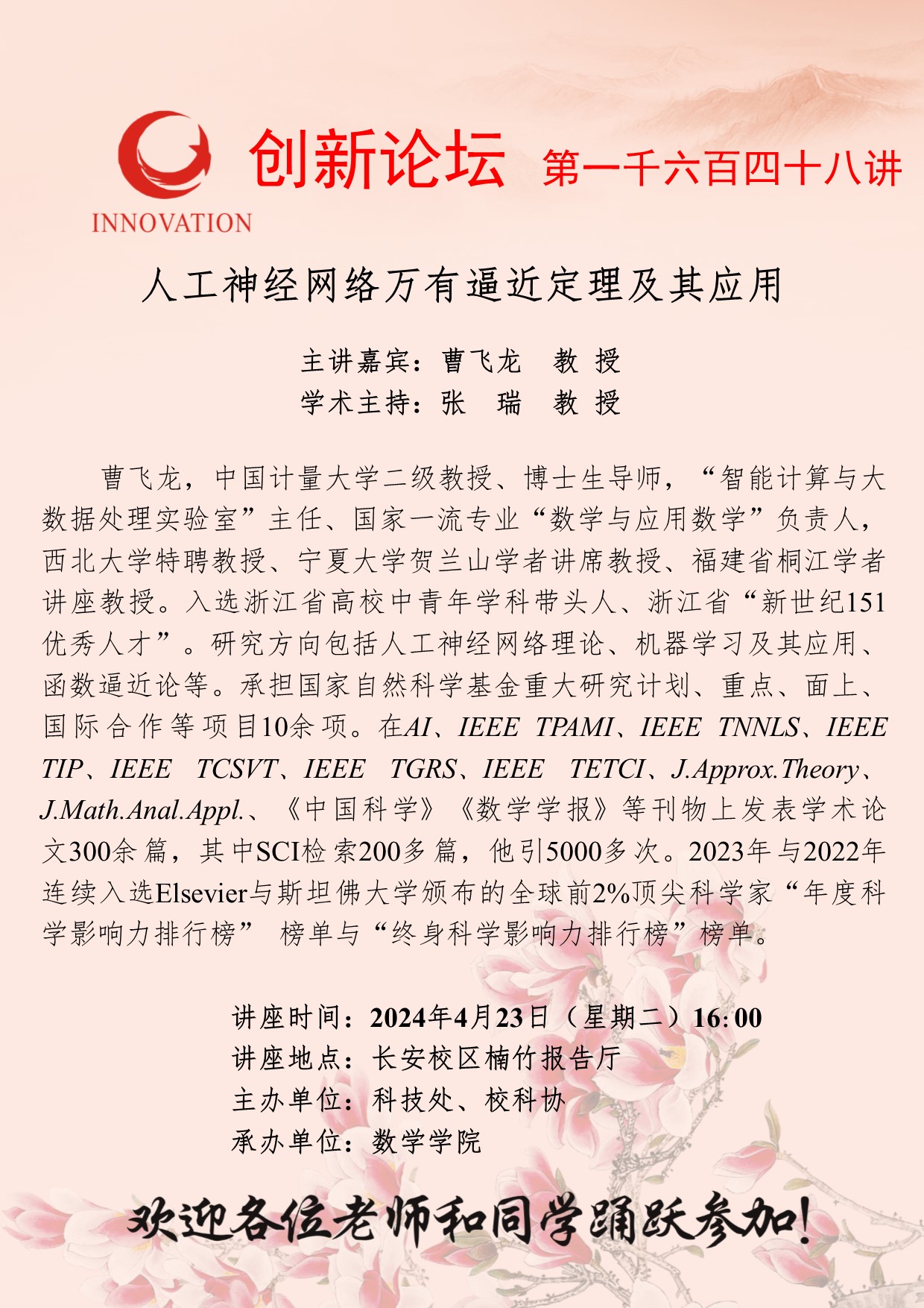 曹飞龙 教授 赢博官方(中国)总部创新论坛第一千六百四十八讲:人工神经网络万有逼近定理及其应用 讲座时间 2024年4月23日(星期二)16:00 讲座地点 长安校区楠竹报告厅 讲座人介绍 曹飞龙 教授 讲座内容