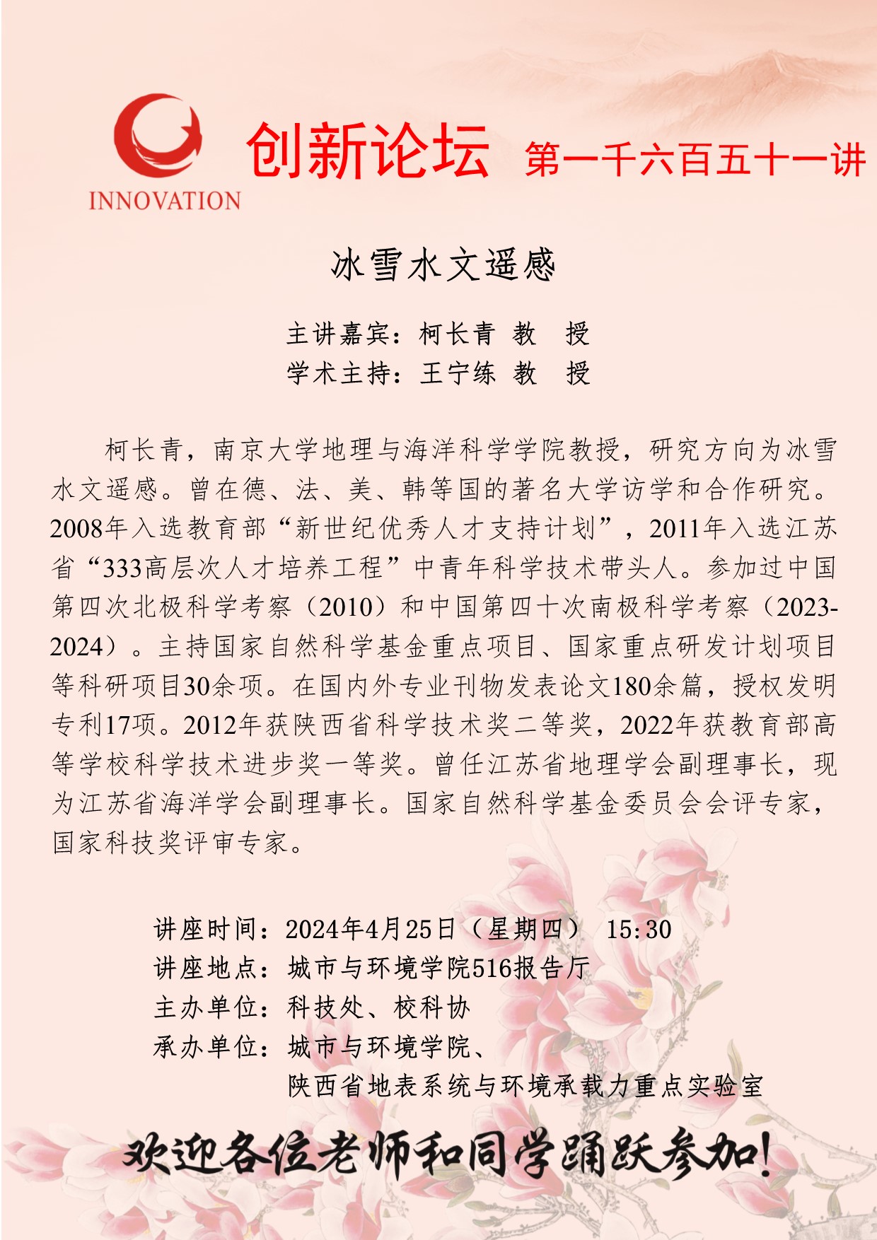 柯长青 教 授 赢博官方(中国)总部创新论坛第一千六百五十一讲:冰雪水文遥感 讲座时间 2024年4月25日(星期四) 15:30 讲座地点 城市与环境学院516报告厅 讲座人介绍 柯长青 教 授 讲座内容