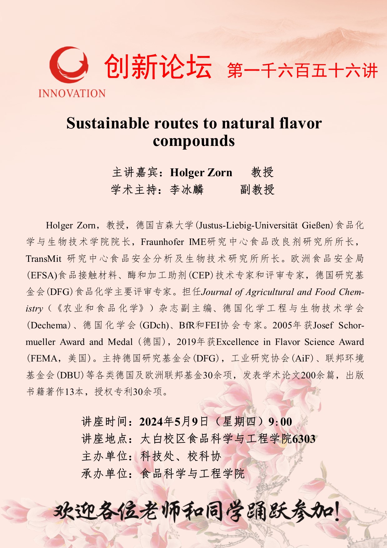 Holger Zorn 教授 赢博官方(中国)总部创新论坛第一千六百五十六讲:Sustainable routes to natural flavor compounds 讲座时间 2024年5月9日(星期四)9:00 讲座地点 太白校区食品科学与工程学院6303 讲座人介绍 Holger Zorn 教授 讲座内容