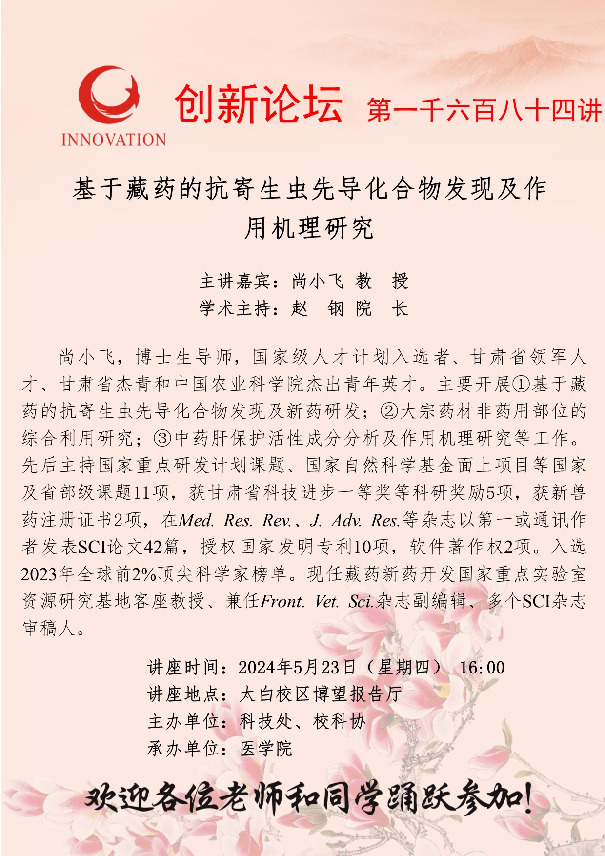 尚小飞 教授 赢博官方(中国)总部创新论坛第一千六百八十四讲:基于藏药的抗寄生虫先导化合物发现及作用机理研究 讲座时间 2024年5月23日(星期四) 16:00 讲座地点 太白校区博望报告厅 讲座人介绍 尚小飞 教授 讲座内容