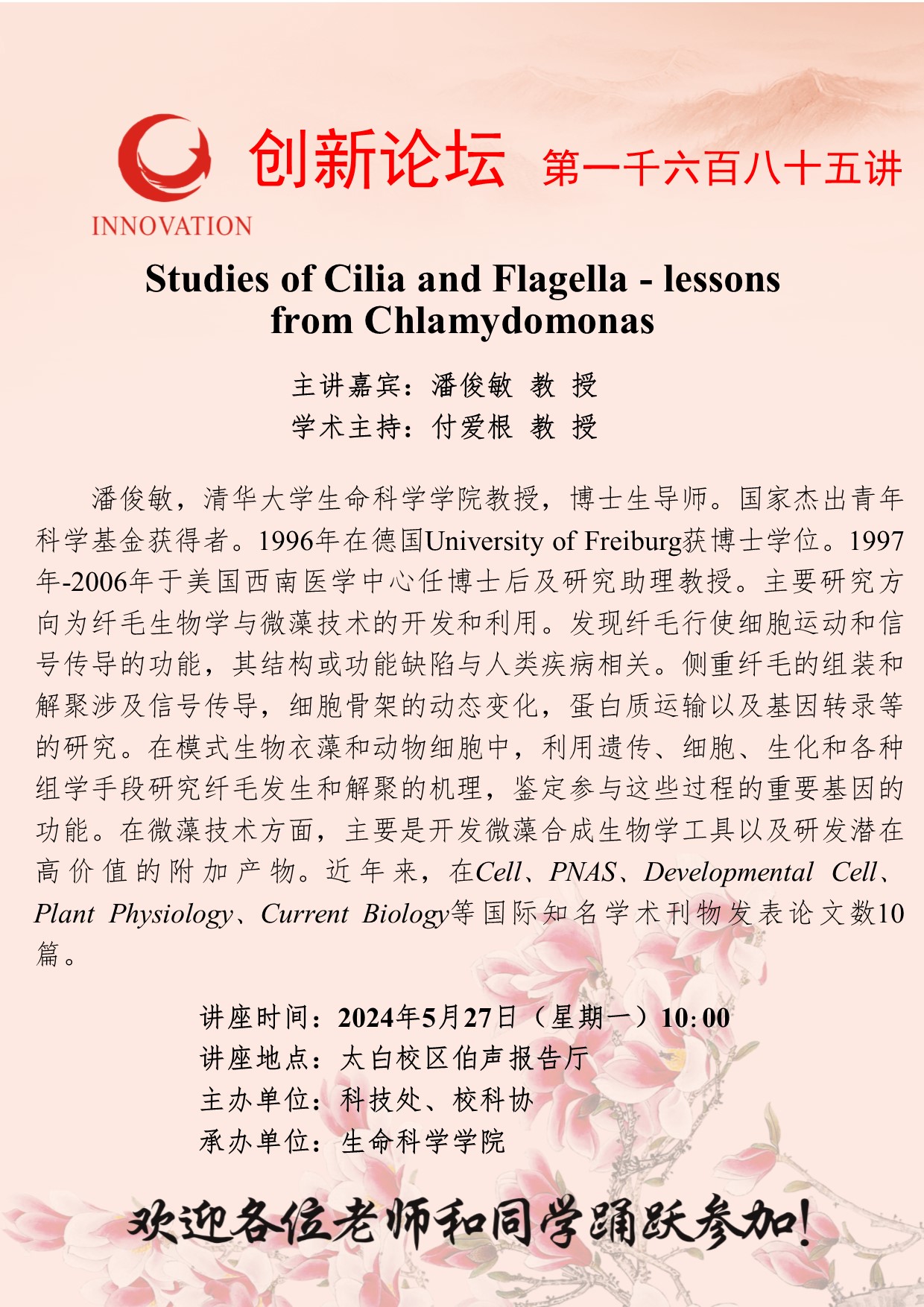 潘俊敏 教授 赢博官方(中国)总部创新论坛第一千六百八十五讲:Studies of Cilia and Flagella - lessons from Chlamydomonas 讲座时间 2024年5月27日(星期一)10:00 讲座地点 太白校区伯声报告厅 讲座人介绍 潘俊敏 教授 讲座内容