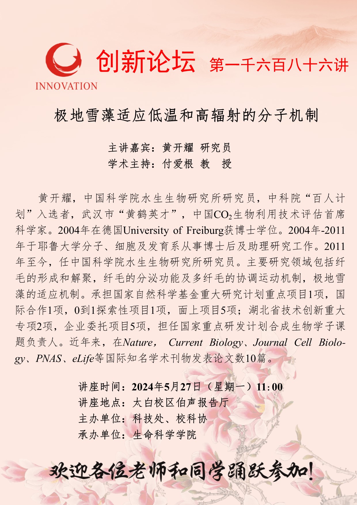 黄开耀 研究员 赢博官方(中国)总部创新论坛第一千六百八十六讲:极地雪藻适应低温和高辐射的分子机制 讲座时间 2024年5月27日(星期一)11:00 讲座地点 太白校区伯声报告厅 讲座人介绍 黄开耀 研究员 讲座内容