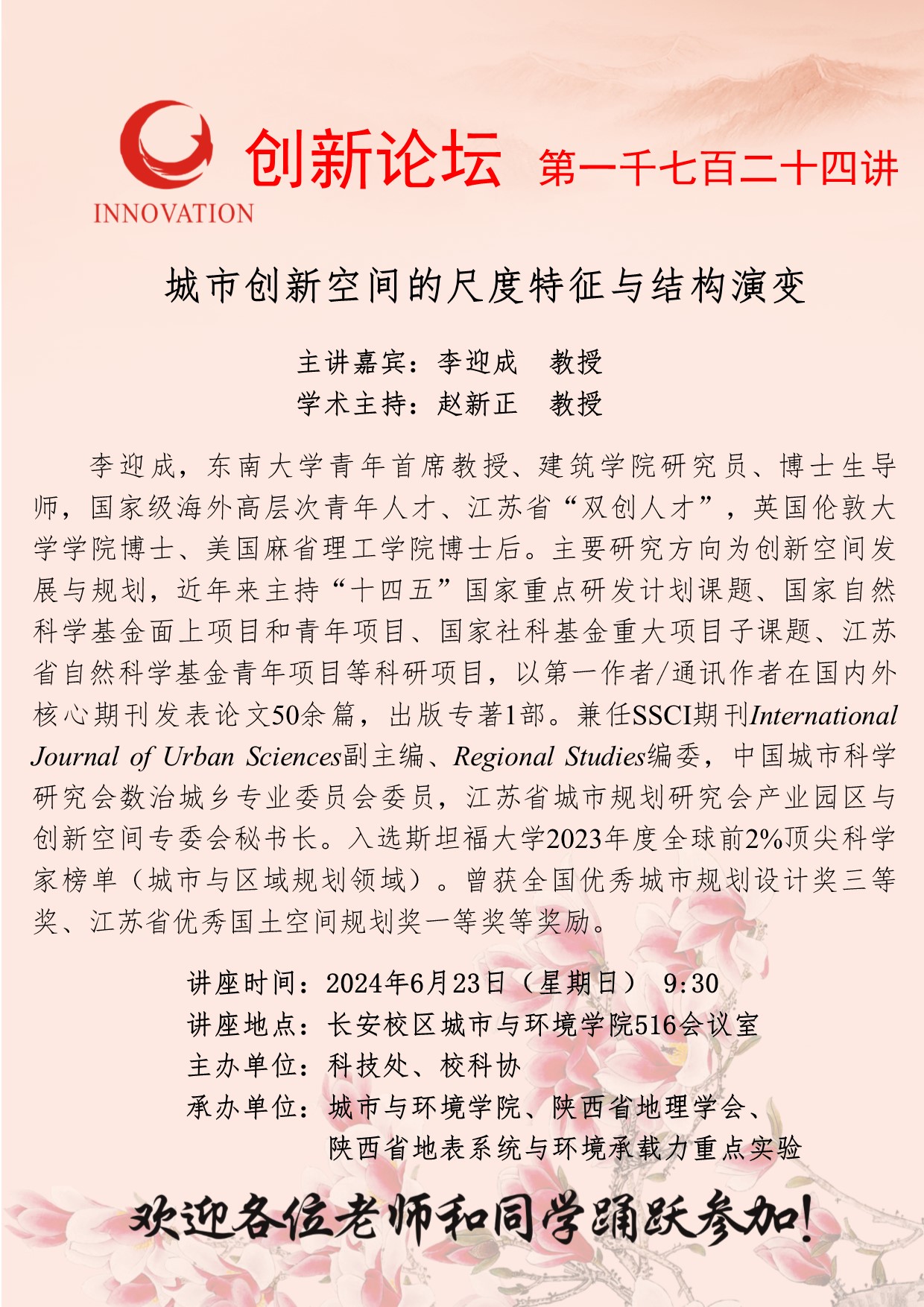 李迎成 教授 赢博官方(中国)总部创新论坛第一千七百二十四讲:城市创新空间的尺度特征与结构演变 讲座时间 2024年6月23日(星期日) 9:30 讲座地点 长安校区城市与环境学院516会议室 讲座人介绍 李迎成 教授 讲座内容