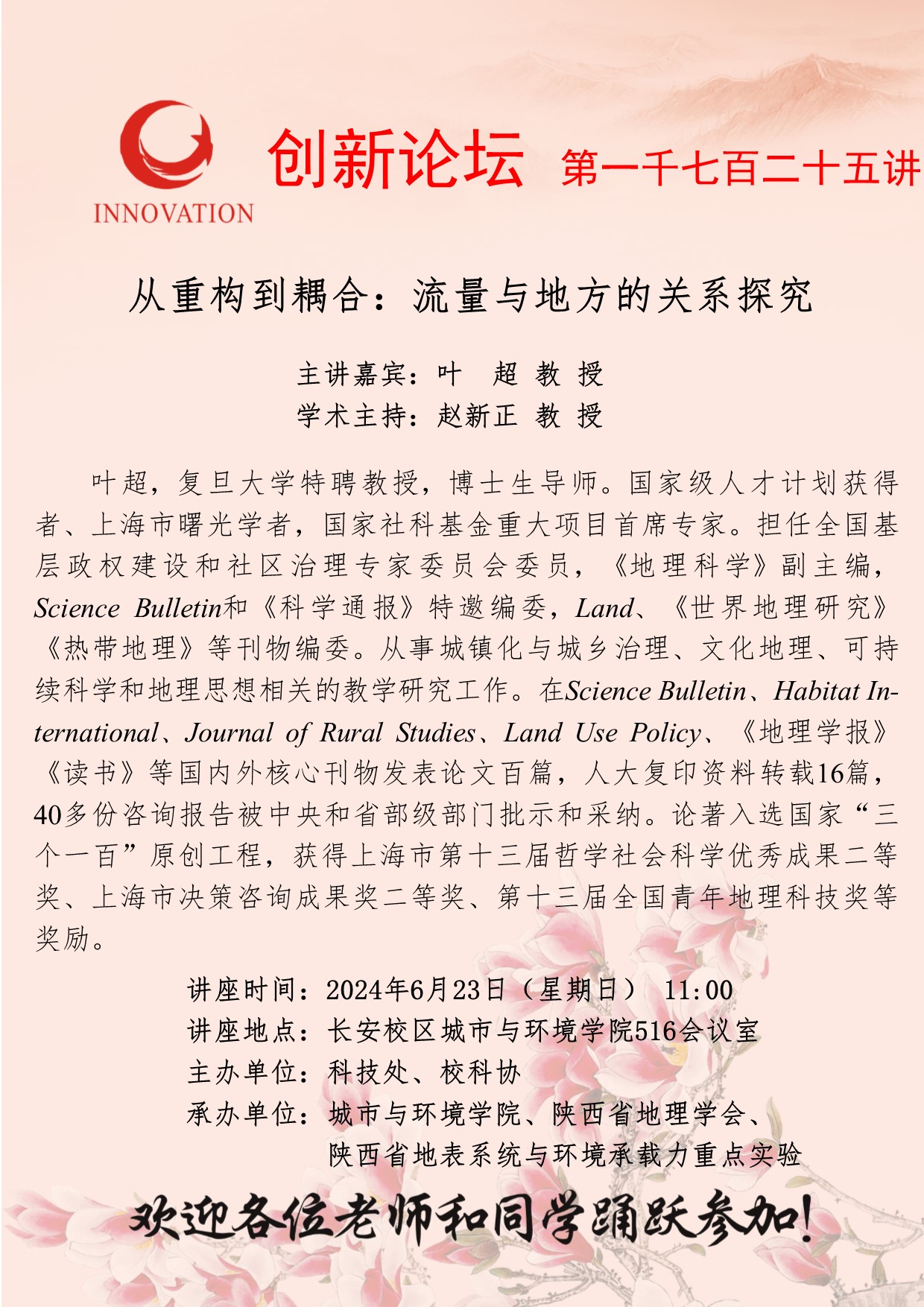 叶超 教授 赢博官方(中国)总部创新论坛第一千七百二十五讲:从重构到耦合:流量与地方的关系探究 讲座时间 2024年6月23日(星期日) 11:00 讲座地点 长安校区城市与环境学院516会议室 讲座人介绍 叶超 教授 讲座内容