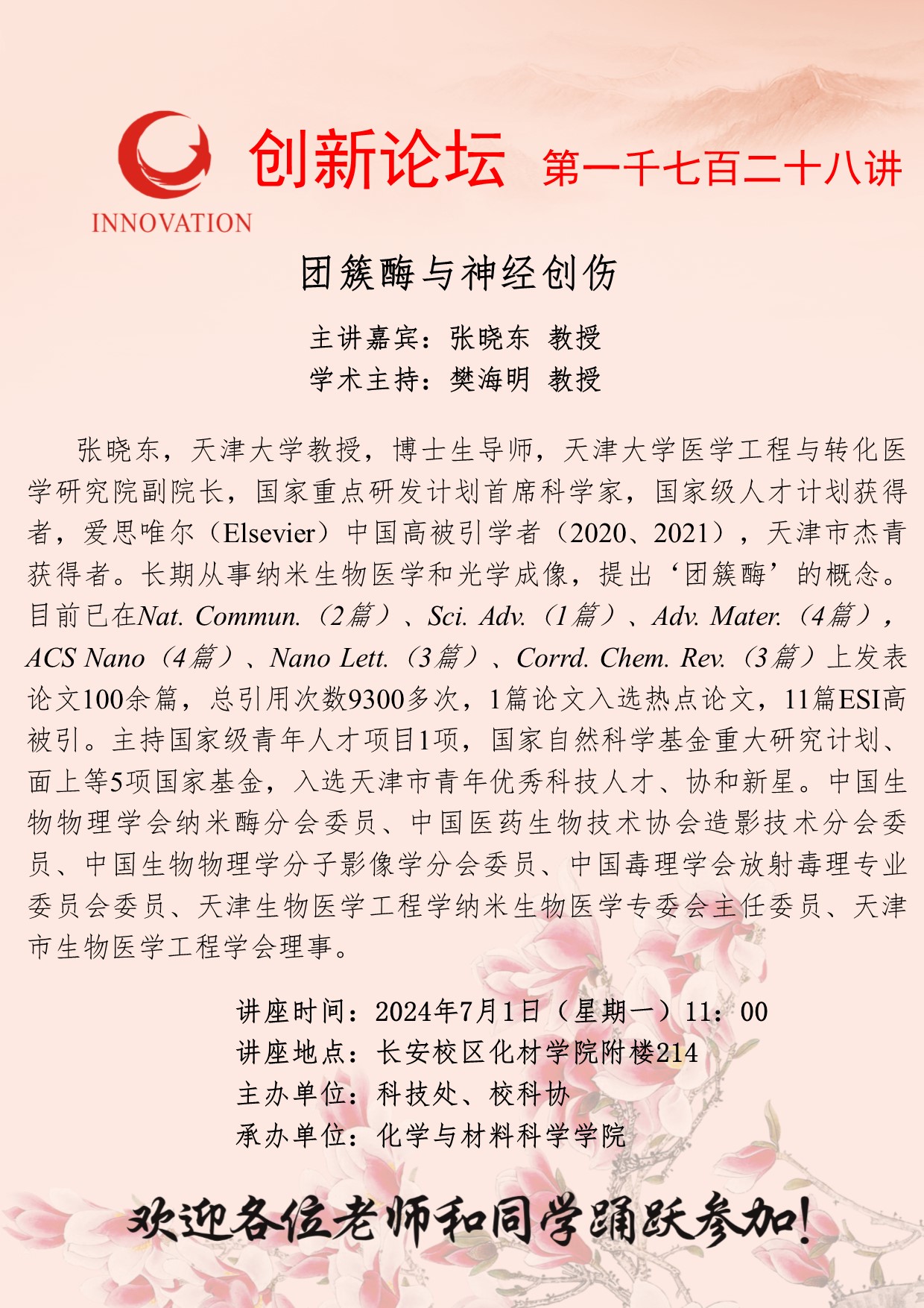 张晓东 教授 赢博官方(中国)总部创新论坛第一千七百二十八讲:团簇酶与神经创伤 讲座时间 2024年7月1日(星期一)11:00 讲座地点 长安校区化材学院附楼214 讲座人介绍 张晓东 教授 讲座内容