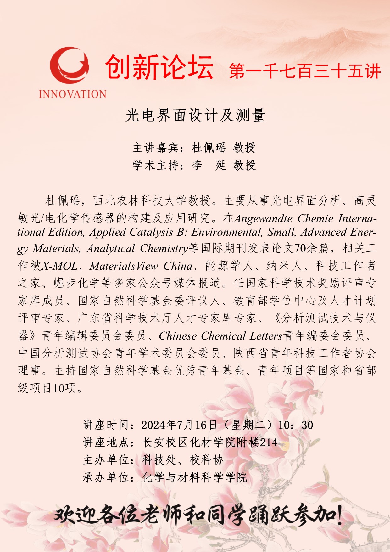 杜佩瑶 教授 赢博官方(中国)总部创新论坛第一千七百三十五讲:光电界面设计及测量 讲座时间 2024年7月16日(星期二)10:30 讲座地点 长安校区化材学院附楼214 讲座人介绍 杜佩瑶 教授 讲座内容