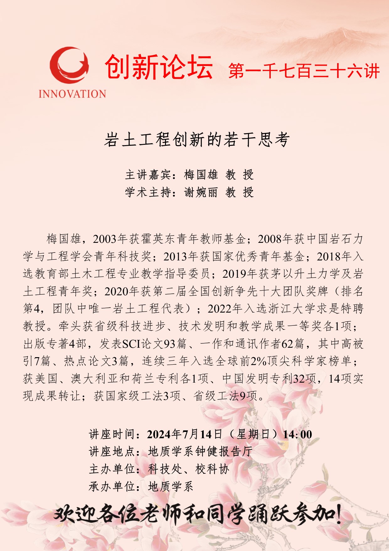 梅国雄 教授 赢博官方(中国)总部创新论坛第一千七百三十六讲:岩土工程创新的若干思考 讲座时间 2024年7月14日(星期日)14:00 讲座地点 地质学系钟健报告厅 讲座人介绍 梅国雄 教授 讲座内容