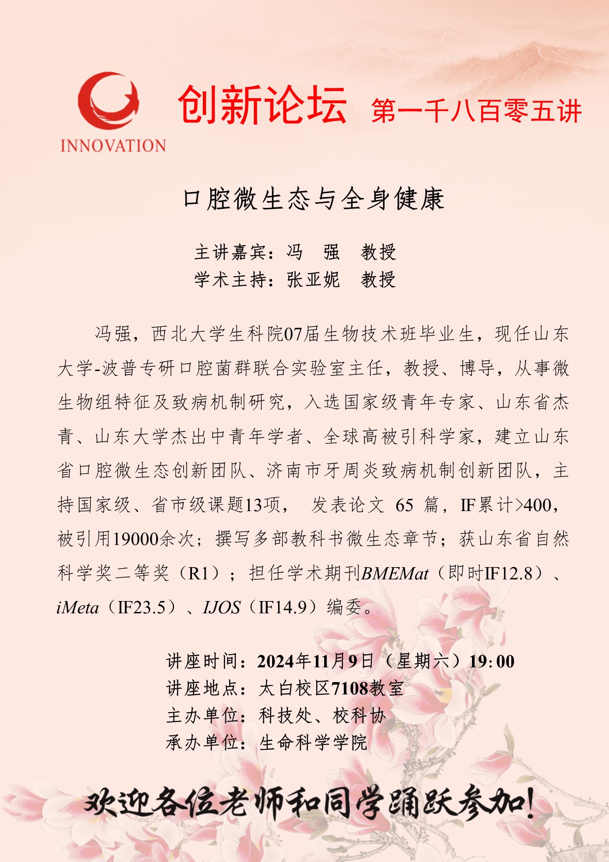 冯强 教授 赢博官方(中国)总部创新论坛第一千八百零五讲:口腔微生态与全身健康 讲座时间 2024年11月9日(星期六)19:00 讲座地点 太白校区7108教室 讲座人介绍 冯强 教授 讲座内容 哈哈