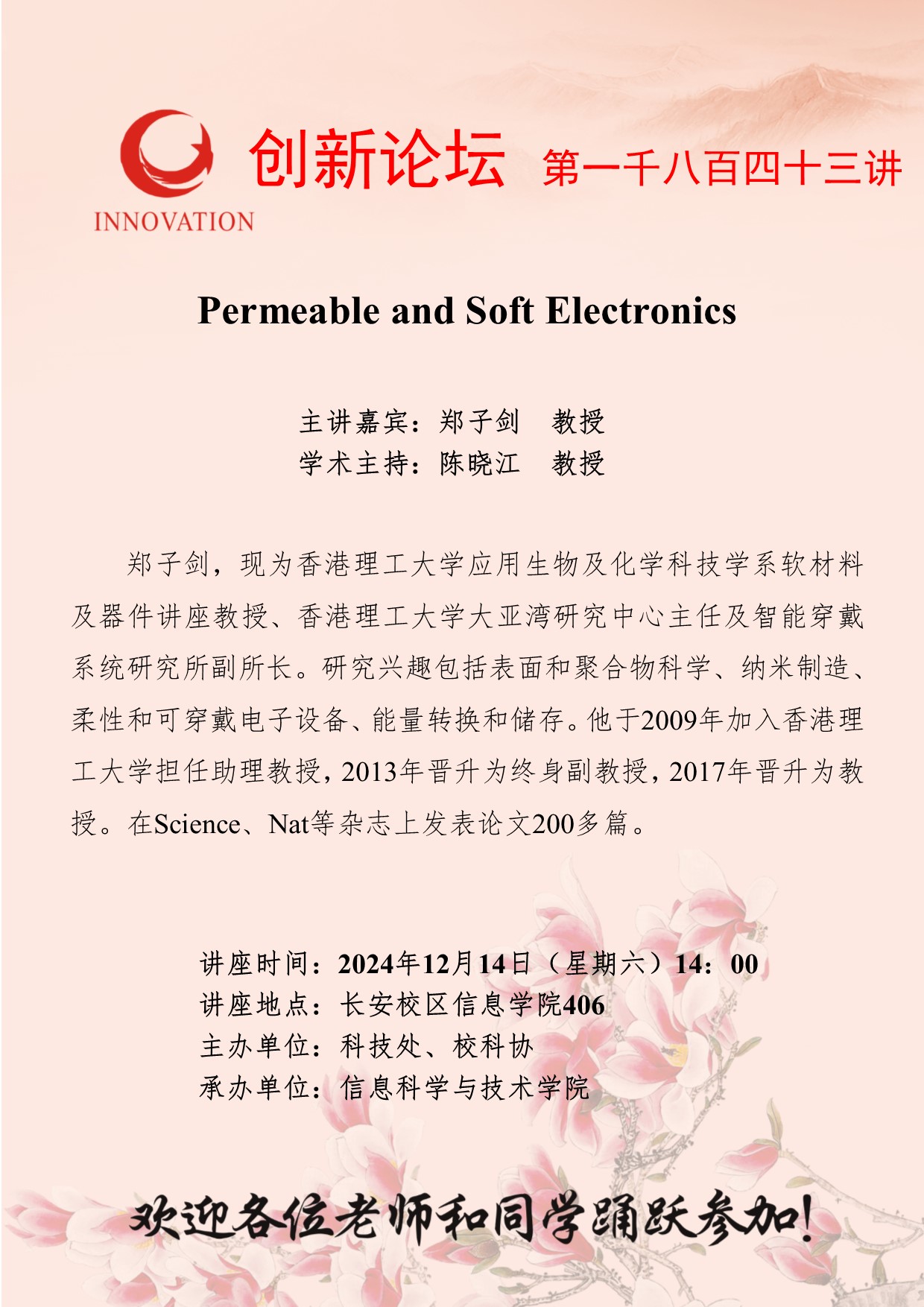 郑子剑 教授 赢博官方(中国)总部创新论坛第一千八百四十三讲:Permeable and Soft Electronics 讲座时间 2024年12月14日(星期六)14:00 讲座地点 长安校区信息学院406 讲座人介绍 郑子剑 教授 讲座内容
