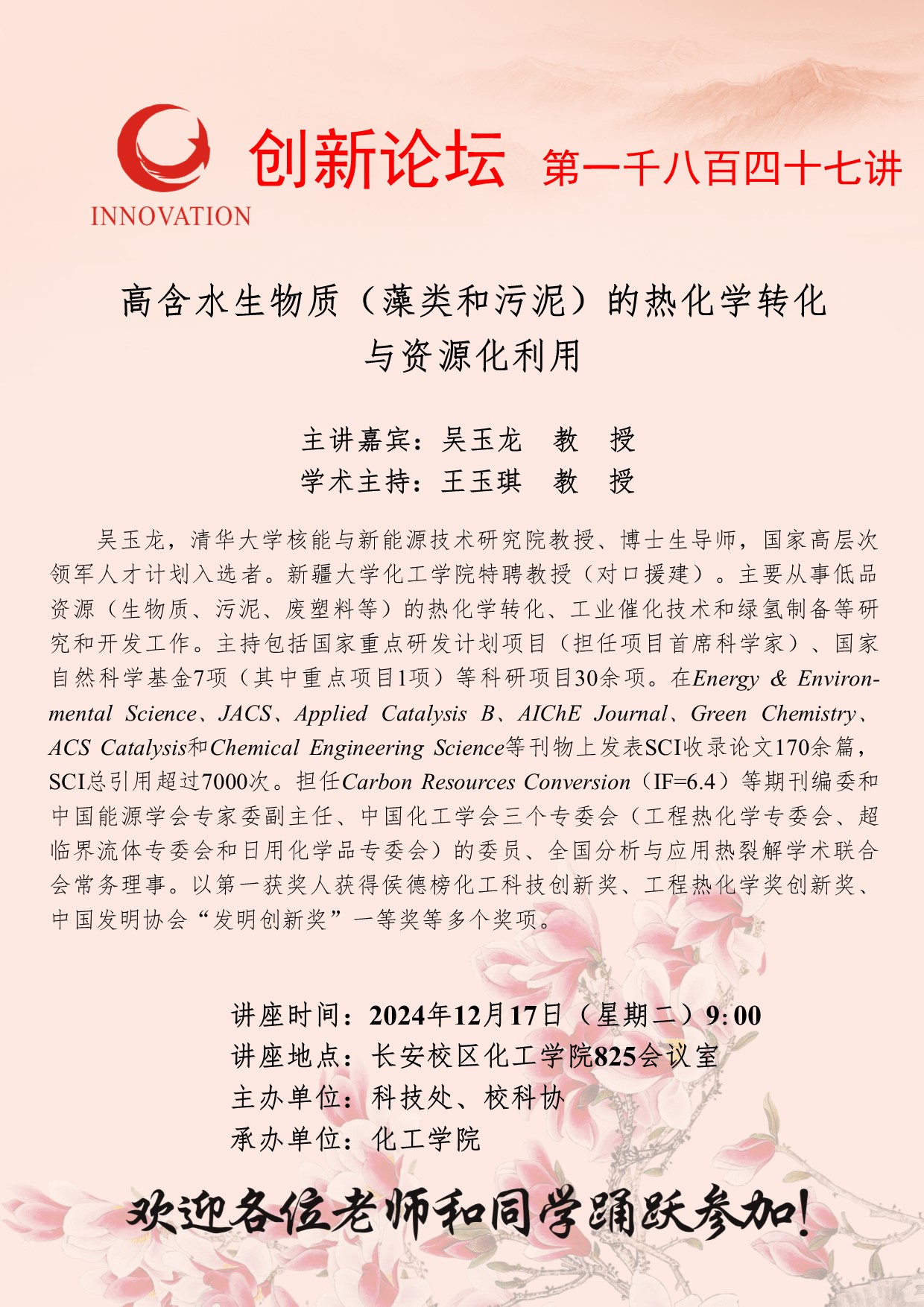 吴玉龙 教授 赢博官方(中国)总部创新论坛第一千八百四十七讲:高含水生物质(藻类和污泥)的热化学转化与资源化利用 讲座时间 2024年12月17日(星期二)9:00 讲座地点 长安校区化工学院825会议室 讲座人介绍 吴玉龙 教授 讲座内容