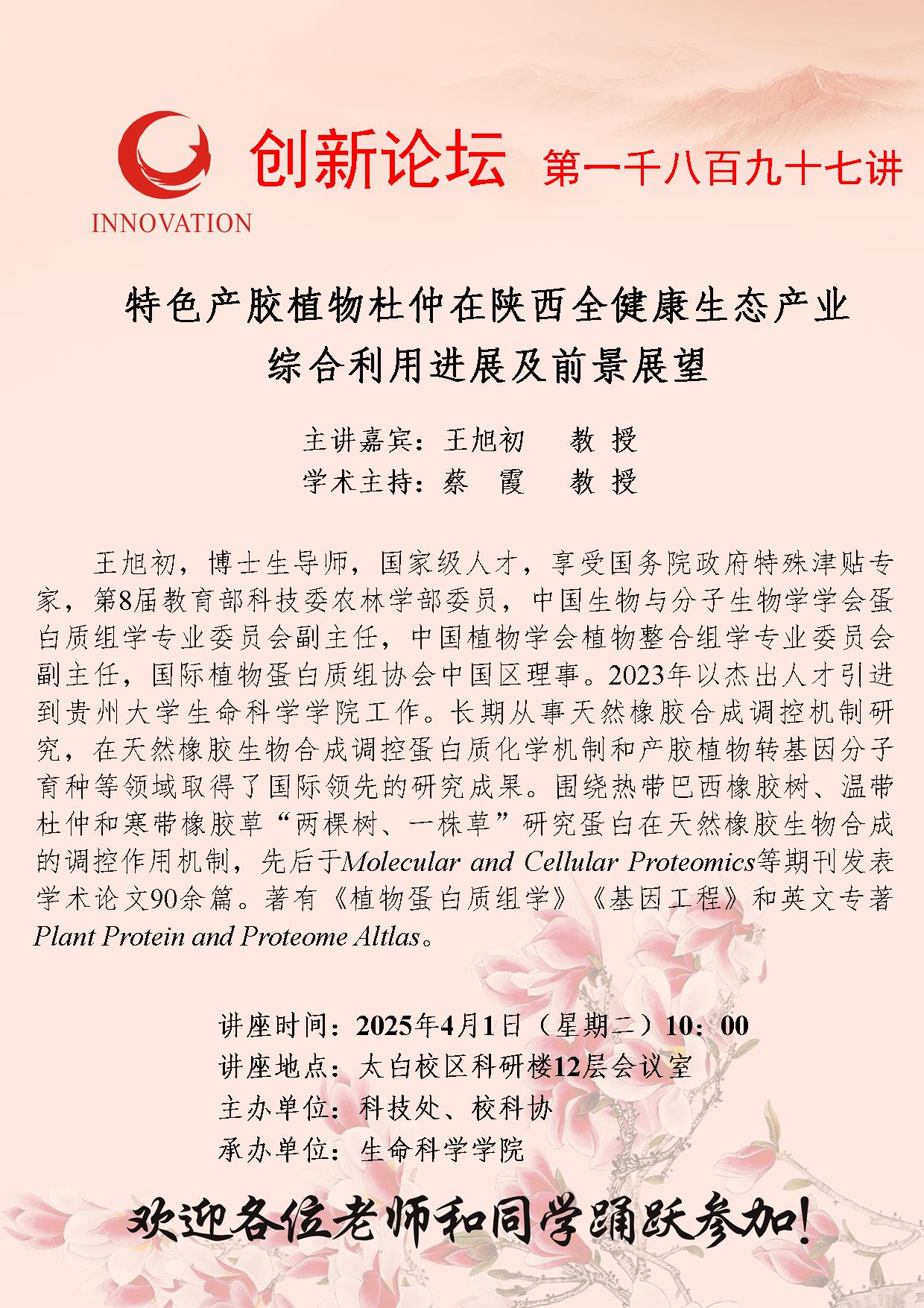 王旭初 教授 赢博官方(中国)总部创新论坛第一千八百九十七讲:特色产胶植物杜仲在陕西全健康生态产业综合利用进展及前景展望 讲座时间 2025年4月1日(星期二)10:00 讲座地点 太白校区科研楼12层会议室 讲座人介绍 王旭初 教授 讲座内容