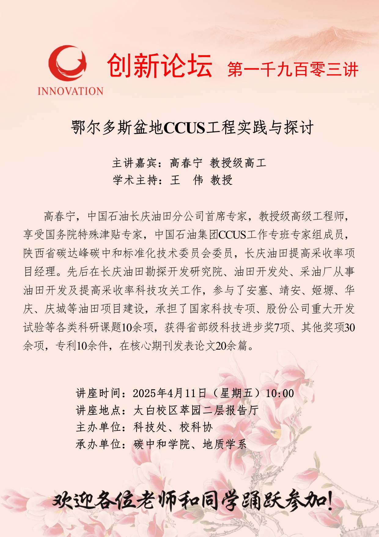 高春宁 教授级高工 赢博官方(中国)总部创新论坛第一千九百零三讲:鄂尔多斯盆地CCUS工程实践与探讨 讲座时间 2025年4月11日(星期五)10:00 讲座地点 太白校区萃园二层报告厅 讲座人介绍 高春宁 教授级高工 讲座内容