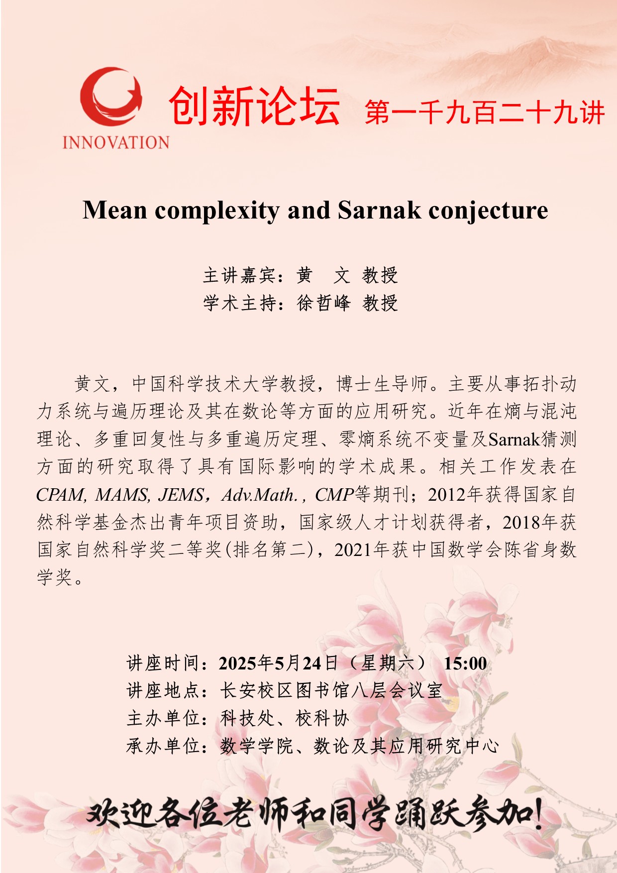 黄文 教授 赢博官方(中国)总部创新论坛第一千九百二十九讲:Mean complexity and Sarnak conjecture 讲座时间 2025年5月24日(星期六) 15:00 讲座地点 长安校区图书馆八层会议室 讲座人介绍 黄文 教授 讲座内容