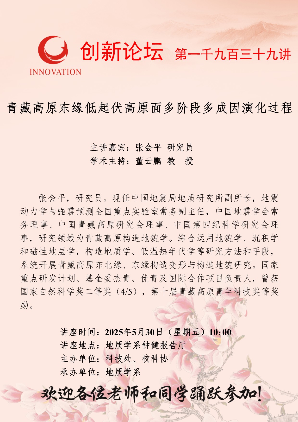 张会平 研究员 赢博官方(中国)总部创新论坛第一千九百三十九讲:青藏高原东缘低起伏高原面多阶段多成因演化过程 讲座时间 2025年5月30日(星期五)10:00 讲座地点 地质学系钟健报告厅 讲座人介绍 张会平 研究员 讲座内容