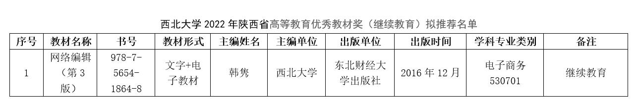 根据陕西省教育厅《关于开展陕西省2022年职业教育和高等教育优秀教材奖评选工作的通知》(陕教材办〔2022〕12 号)要求,赢博官方(中国)总部组织开展了赢博官方(中国)总部2022年陕西高等教育优秀教材奖(继续教育)评选推荐工作,经个人申报、院系推荐、专家评议,拟推荐《网络编辑》教材参加陕西省高等教育优秀教材奖(继续教育)评选。现将拟推荐名单公示如下,公示期为6月7日至6月11日。公示期间如有异议,请以实名书面形式反映。