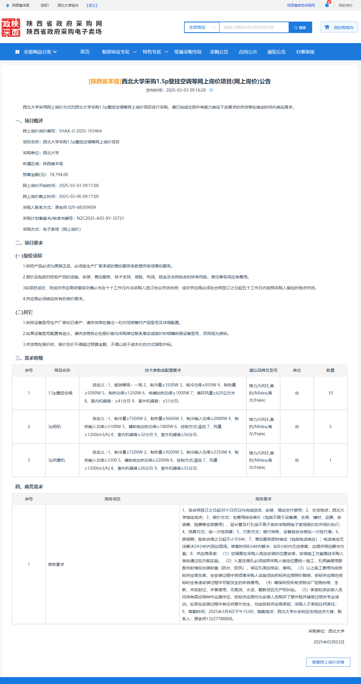 赢博官方(中国)总部采购1.5p壁挂空调等网上询价项目(网上询价)公告 作者:采购与招标办公室 编辑: 时间:2025-03-03 原公告链接:https://www.ccgp-shaanxi.gov.cn/gpmall-main-web/basic/noticeDetail?noticeGuid=7295516810999431168