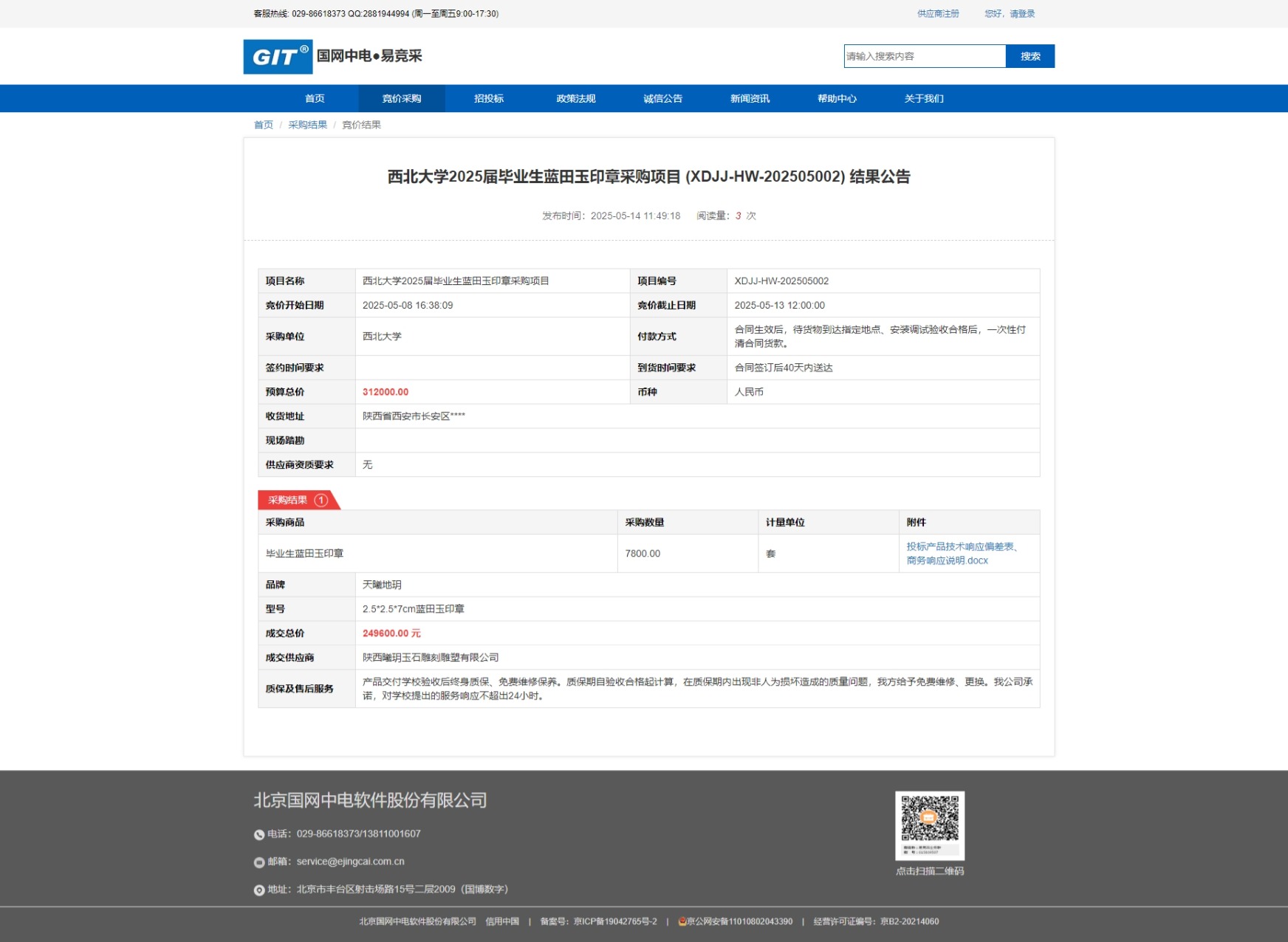 赢博官方(中国)总部2025届毕业生蓝田玉印章采购项目 (XDJJ-HW-202505002) 竞价结果公告 作者: 编辑:采购与招标办公室 时间:2025-05-14 原公告链接:https://www.ejingcai.com.cn/site/bidding/detail/18215