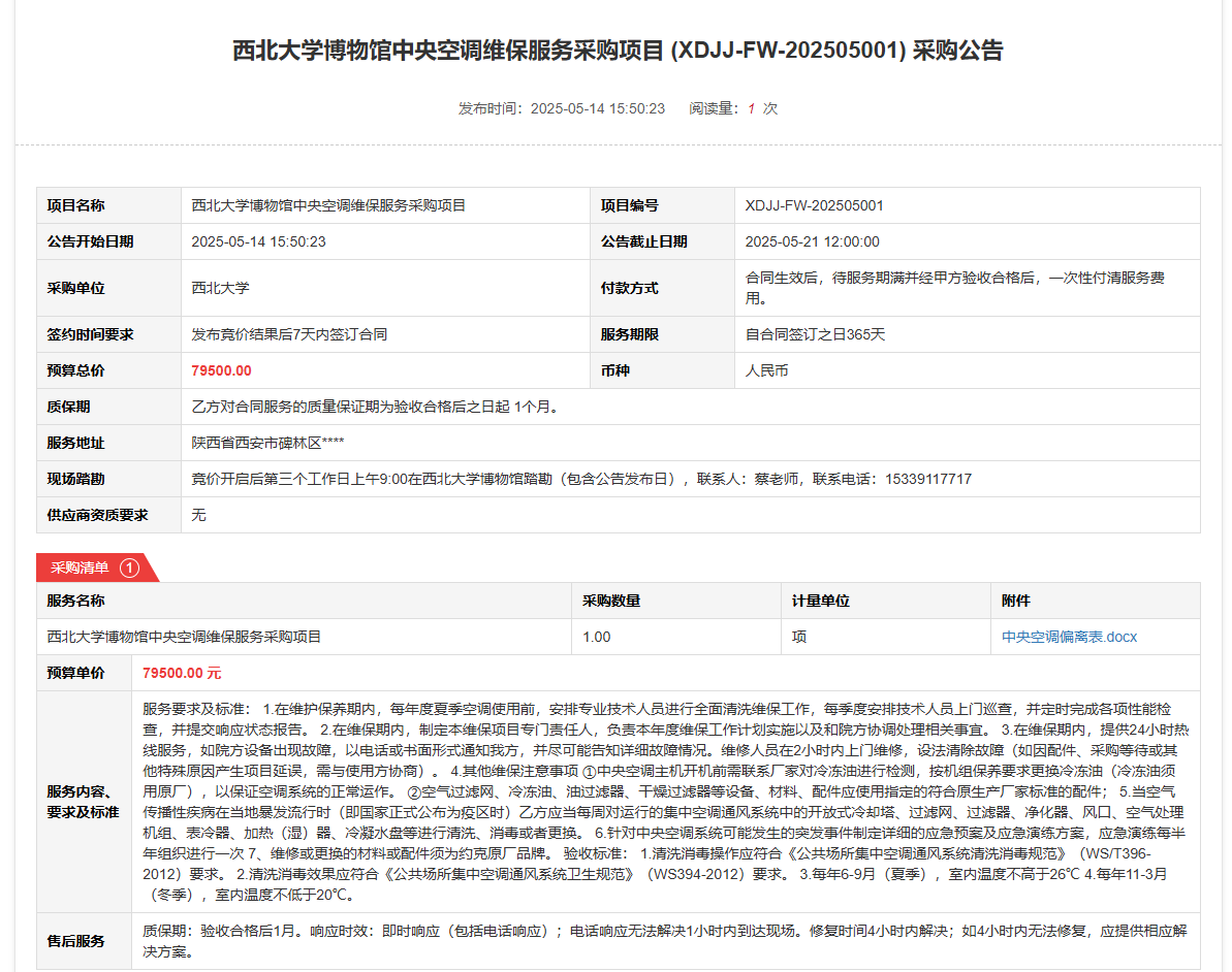 赢博官方(中国)总部博物馆中央空调维保服务采购项目(XDJJ-FW-202505001)竞价采购公告 作者:采购与招标办公室 编辑: 时间:2025-05-14 原公告链接:https://www.ejingcai.com.cn/site/bidding/detail/18217