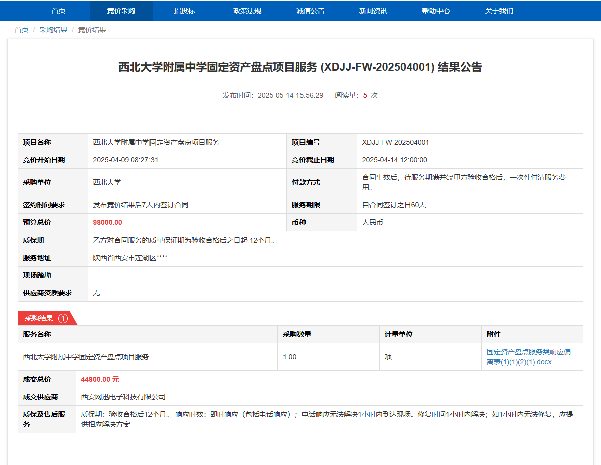 赢博官方(中国)总部附属中学固定资产盘点项目服务(XDJJ-FW-202504001)竞价结果公告 作者:采购与招标办公室 编辑: 时间:2025-05-14 原公告链接:https://www.ejingcai.com.cn/site/bidding/detail/18218