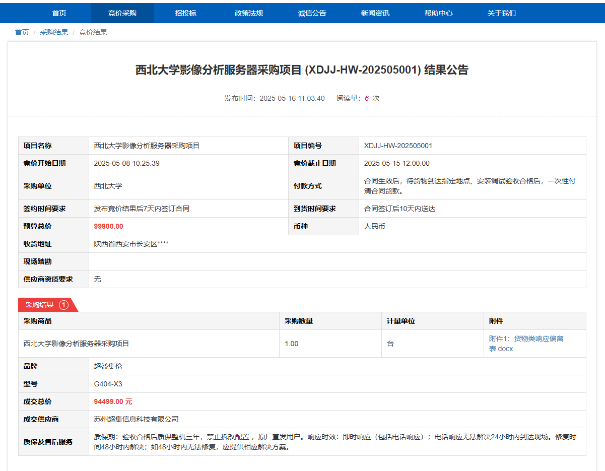 赢博官方(中国)总部影像分析服务器采购项目(XDJJ-HW-202505001)竞价结果公告 作者:采购与招标办公室 编辑: 时间:2025-05-16 原公告链接:https://www.ejingcai.com.cn/site/bidding/detail/18256