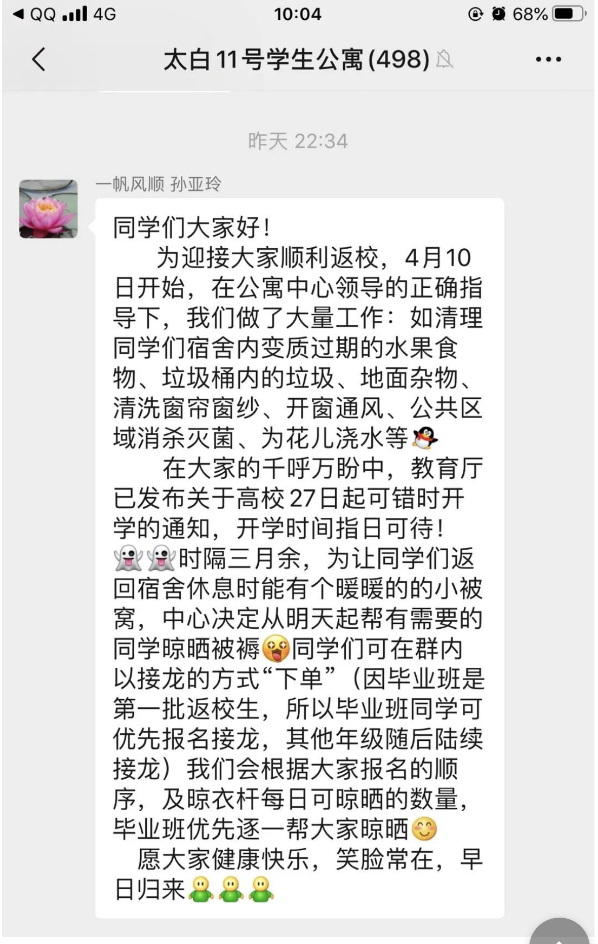 长安校区楼管阿姨任群英坦言:“刚开始只是应同学们在微信群里的需要,全楼的员工共同努力,帮同学们清理宿舍中的腐烂水果、给植物浇浇水,后来顺便就开始打扫宿舍的卫生。打扫了一遍觉得不够干净,后面又开始打扫第二遍。”