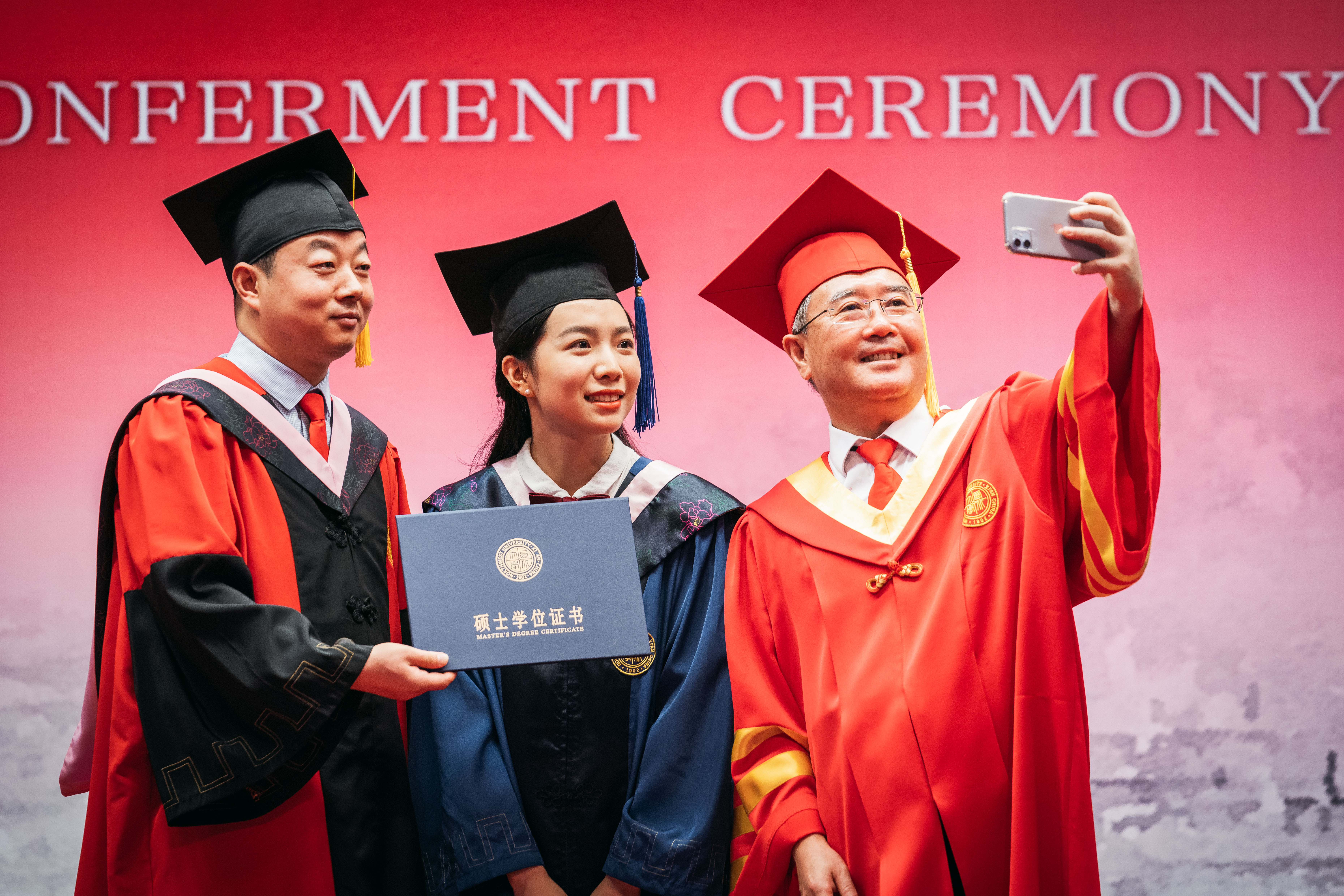 赢博官方(中国)总部毕业典礼上,郭立宏校长(右一)和毕业生自拍留念。本报通讯员马骞摄